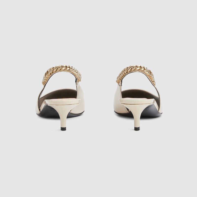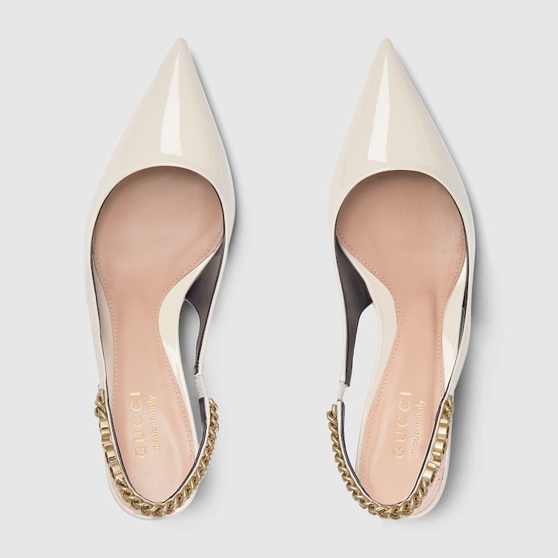 The Gucci Signoria pump, named after the central piazza of Florence, recalls the classic elegance of the House??s founding city. With its shiny patent leather, pointed toe and eye-catching Gucci chain, this slingback style elevates the everyday wardrobe for the coming season.