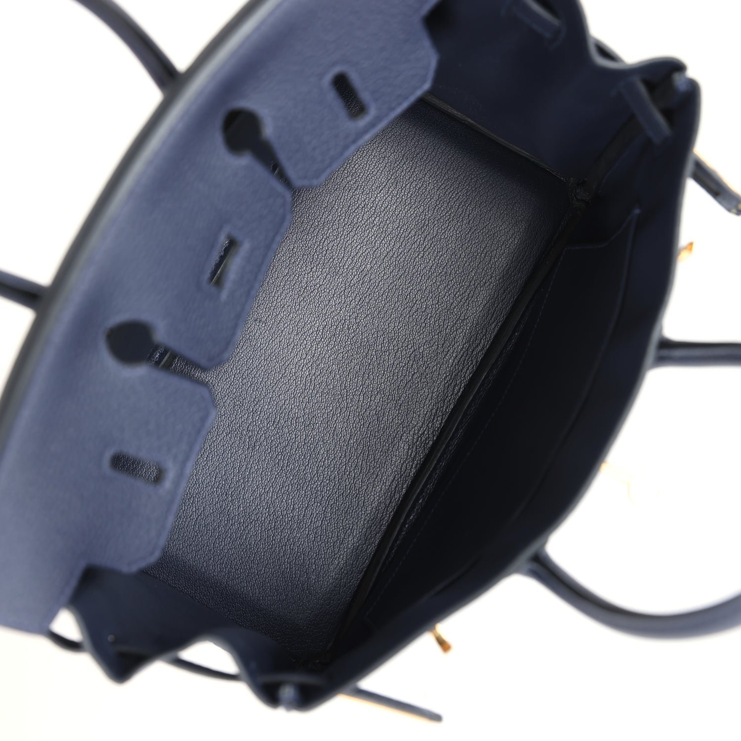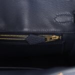The interior is lined with Blue Nuit chevre, has one zip pocket with an Hermès engraved zipper pull and an open pocket on the opposite side.