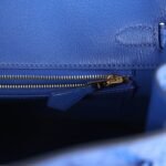 The interior is lined with Bleu Royal chevre and has one zip pocket with an Hermès engraved zipper pull and an open pocket on the opposite side.
