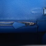 The interior is lined with Bleu Saphir chevre and has one zip pocket with an Hermès engraved zipper pull and an open pocket on the opposite side.
