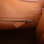 The interior is lined with Gold chevre and has one zip pocket with an Hermès engraved zipper pull and an open pocket on the opposite side.