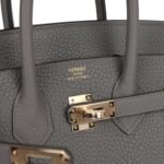 This Birkin is in Gris Meyer togo leather with permabrass hardware, has tonal stitching, front flap, two straps with center toggle closure, clochette with lock and two keys, and double rolled handles.