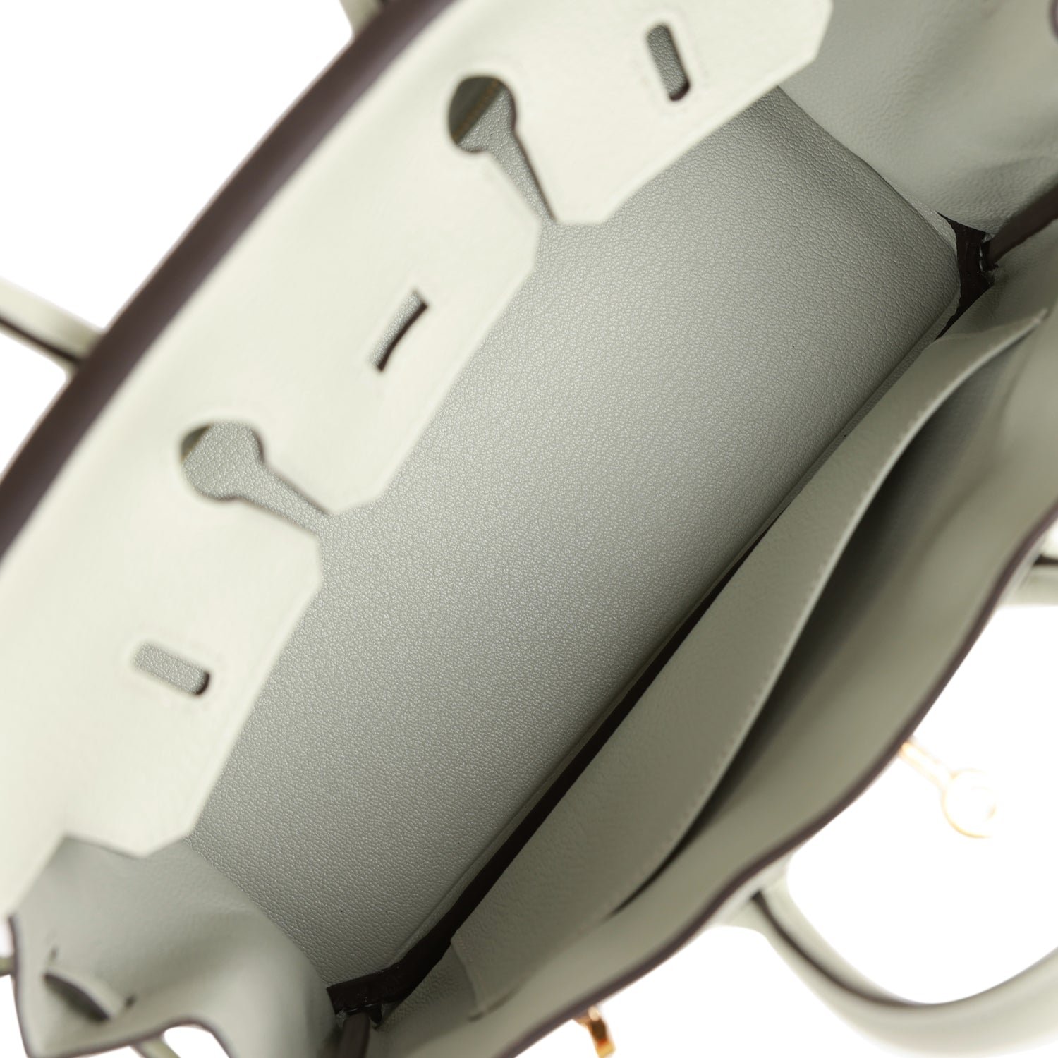 The interior is lined with Gris Nevechevre and has one zip pocket with an Hermès engraved zipper pull and an open pocket on the opposite side.