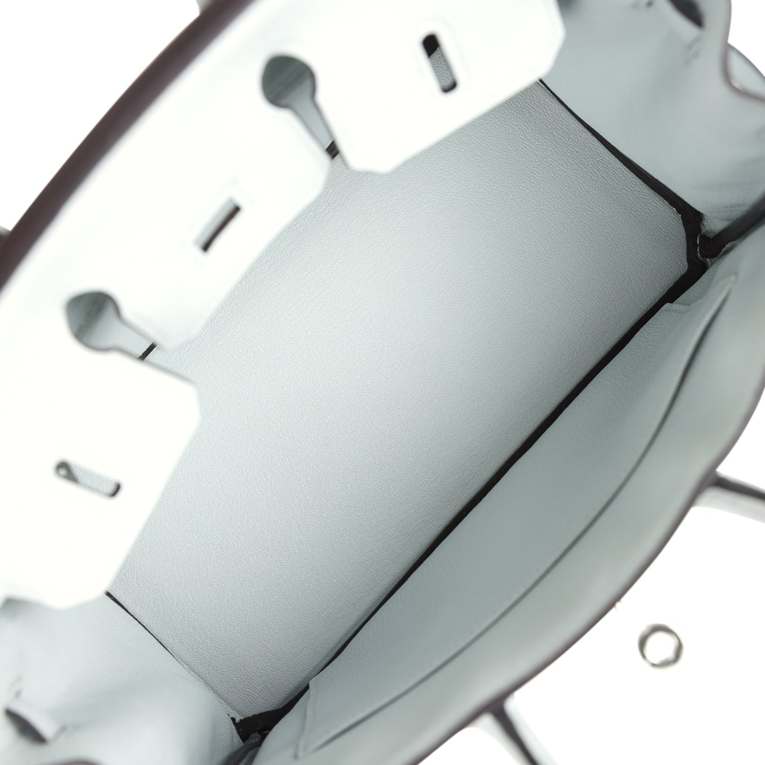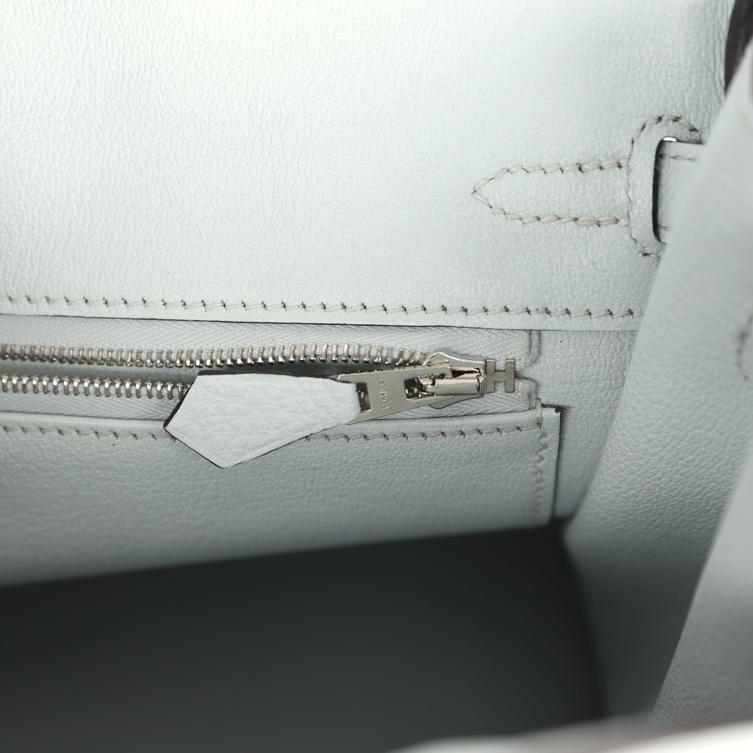 The interior is lined with Gris Platine chevre and has a zip pocket with an Hermès engraved zipper pull and an open pocket on the opposite side.