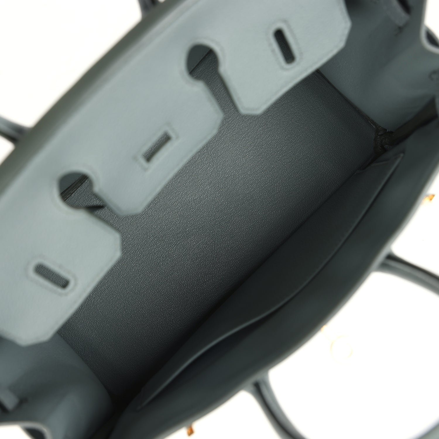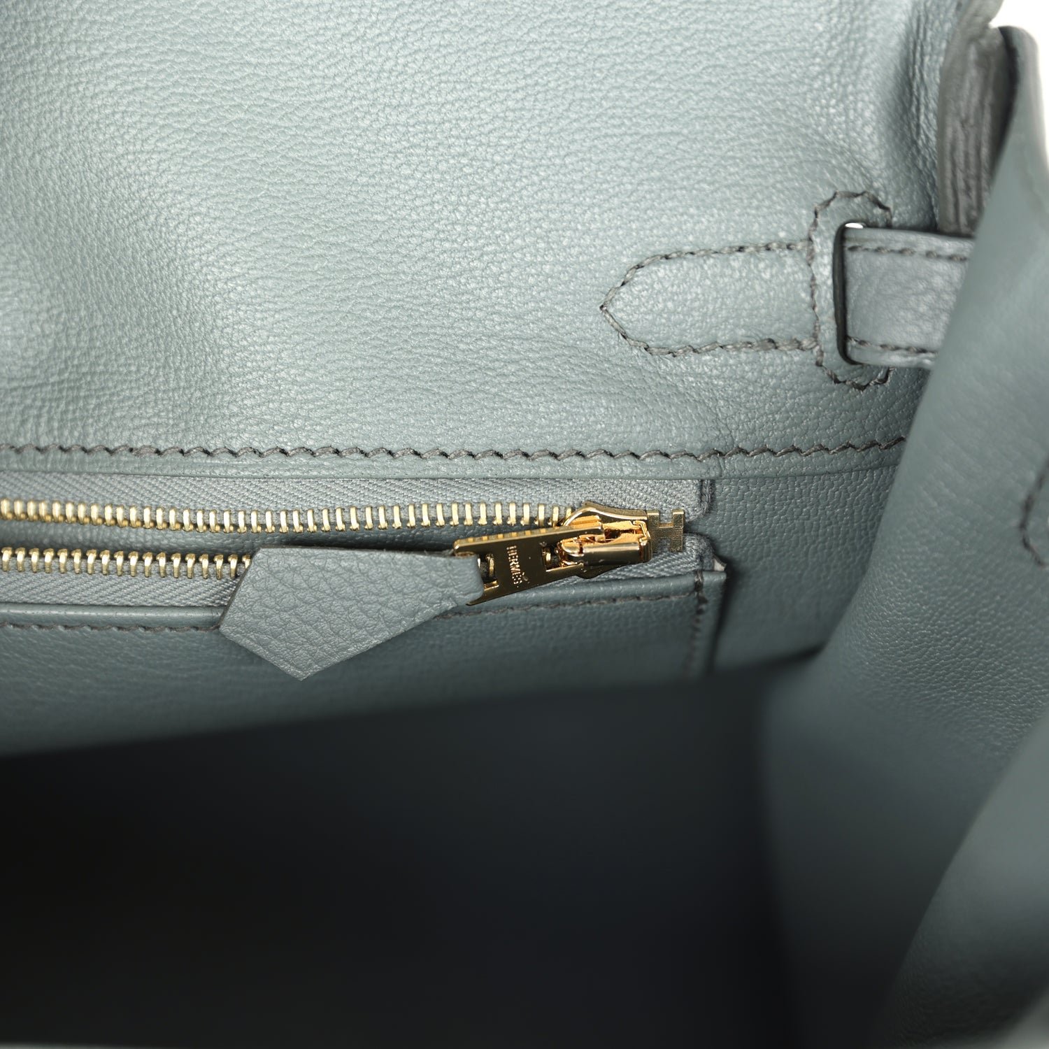 The interior is lined with Vert Amande chevre and has a zip pocket with an Hermès engraved zipper pull and an open pocket on the opposite side.