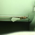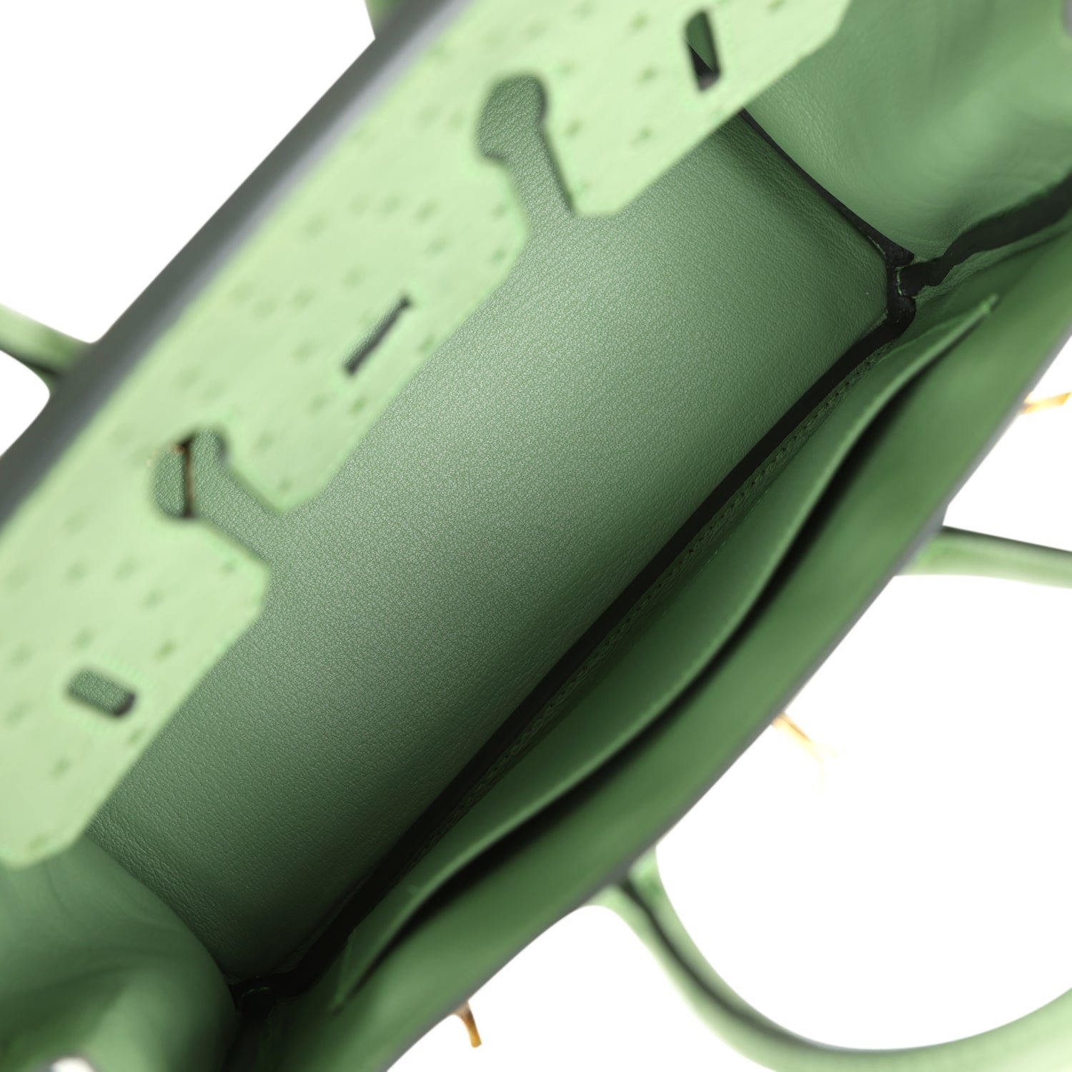 The interior is lined with Vert Criquet chevre and has a zip pocket with an Hermès engraved zipper pull and an open pocket on the opposite side.