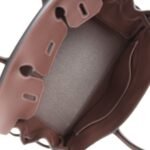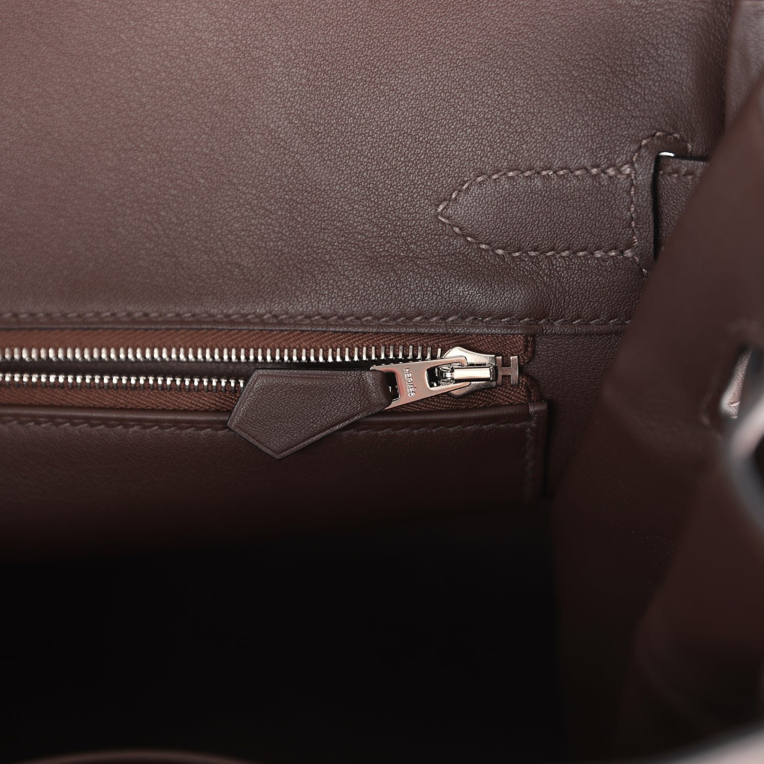 The interior is lined with Moka swift and has one zip pocket with an Hermès engraved pull and one open pocket on the opposite side.