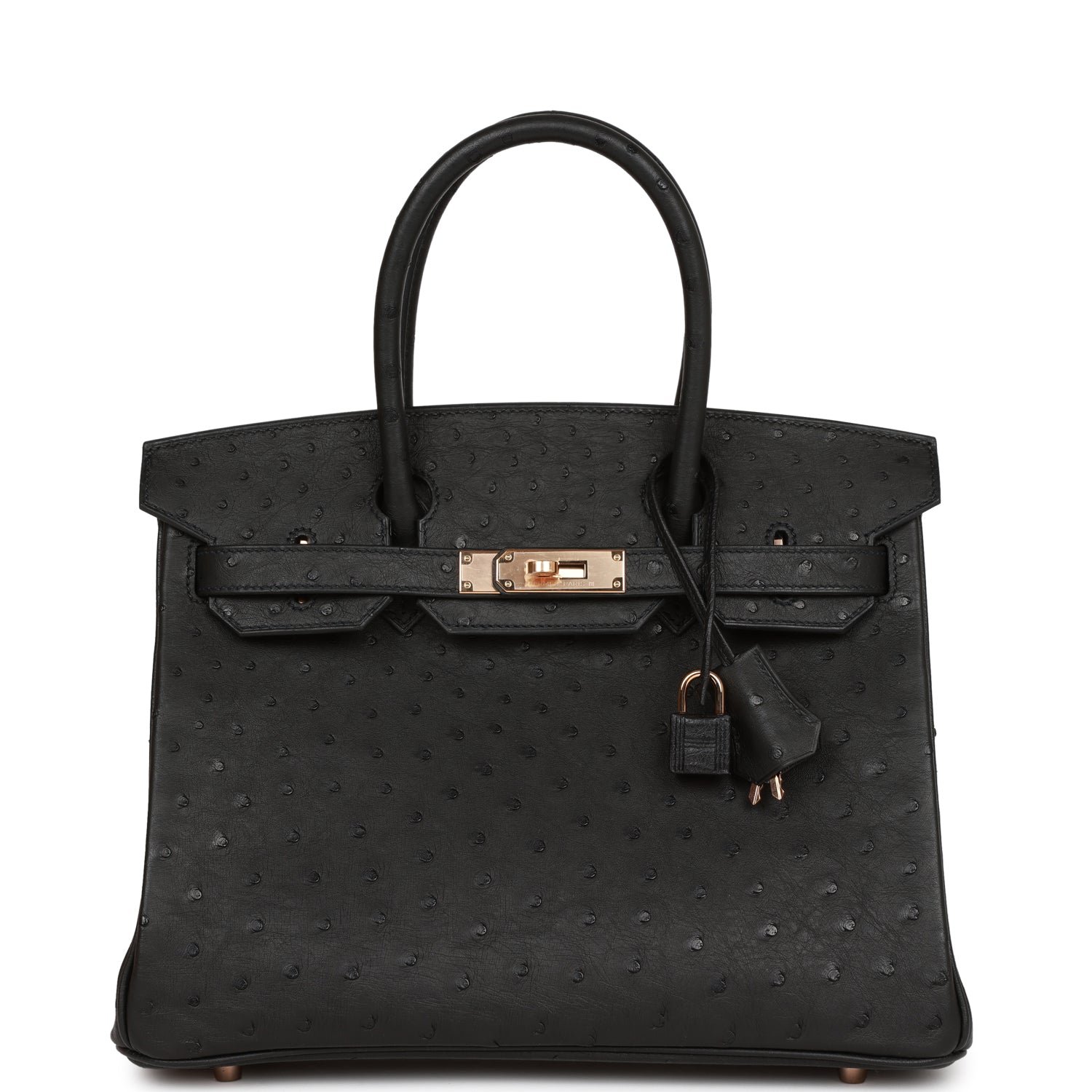 This Birkin is inblack ostrich with rose gold hardware and features tonal stitching,front flap, two straps withcentertoggle closure, clochette with lock and two keys, and double rolled handles.