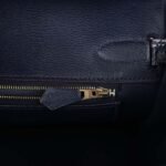 The interior is lined in Bleu Marine chevre leather and has a zip pocket with Hermès engraved pull; pocket on opposite side.