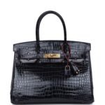 Hermes Birkin 30 Bleu Marine and Rouge H Contour Shiny Porosus Crocodile Gold Hardware