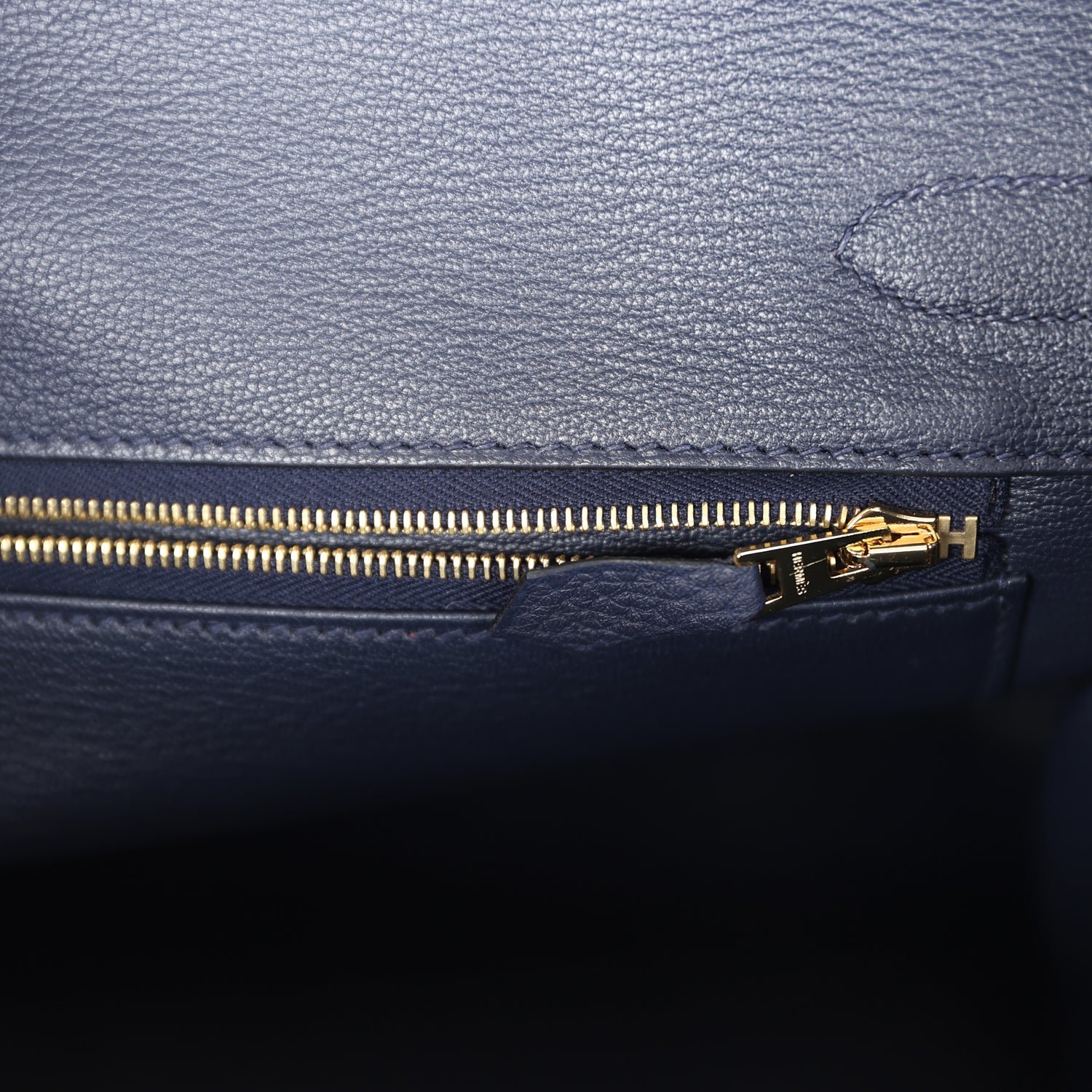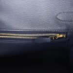 The interior is lined withBleu Nuit chevre and has one zip pocket with an Hermès engraved zipper pull and an open pocket on the opposite side.