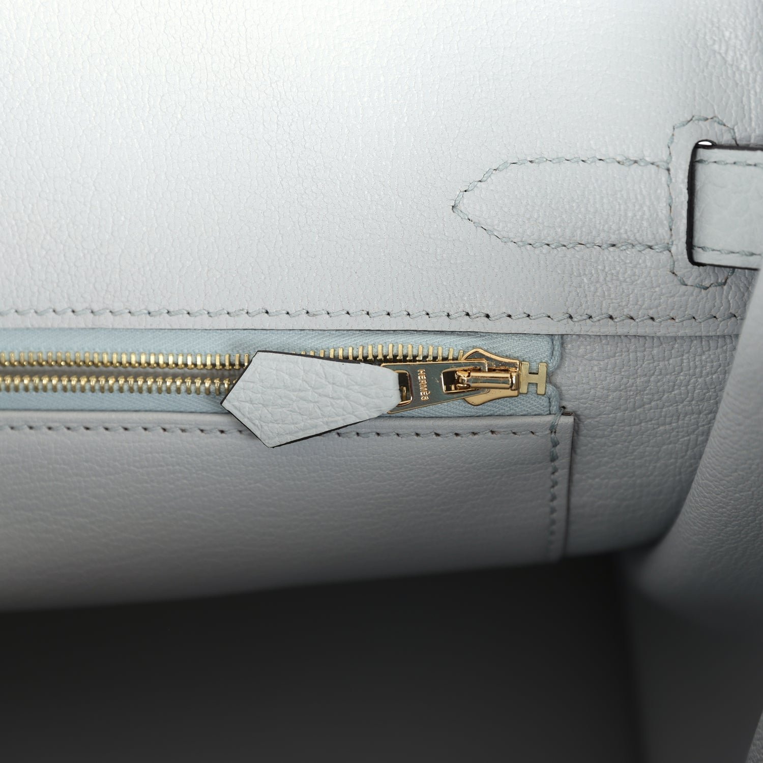 The interior is lined with Bleu Pale chevre and has one zip pocket with an Hermès engraved zipper pull and an open pocket on the opposite side.