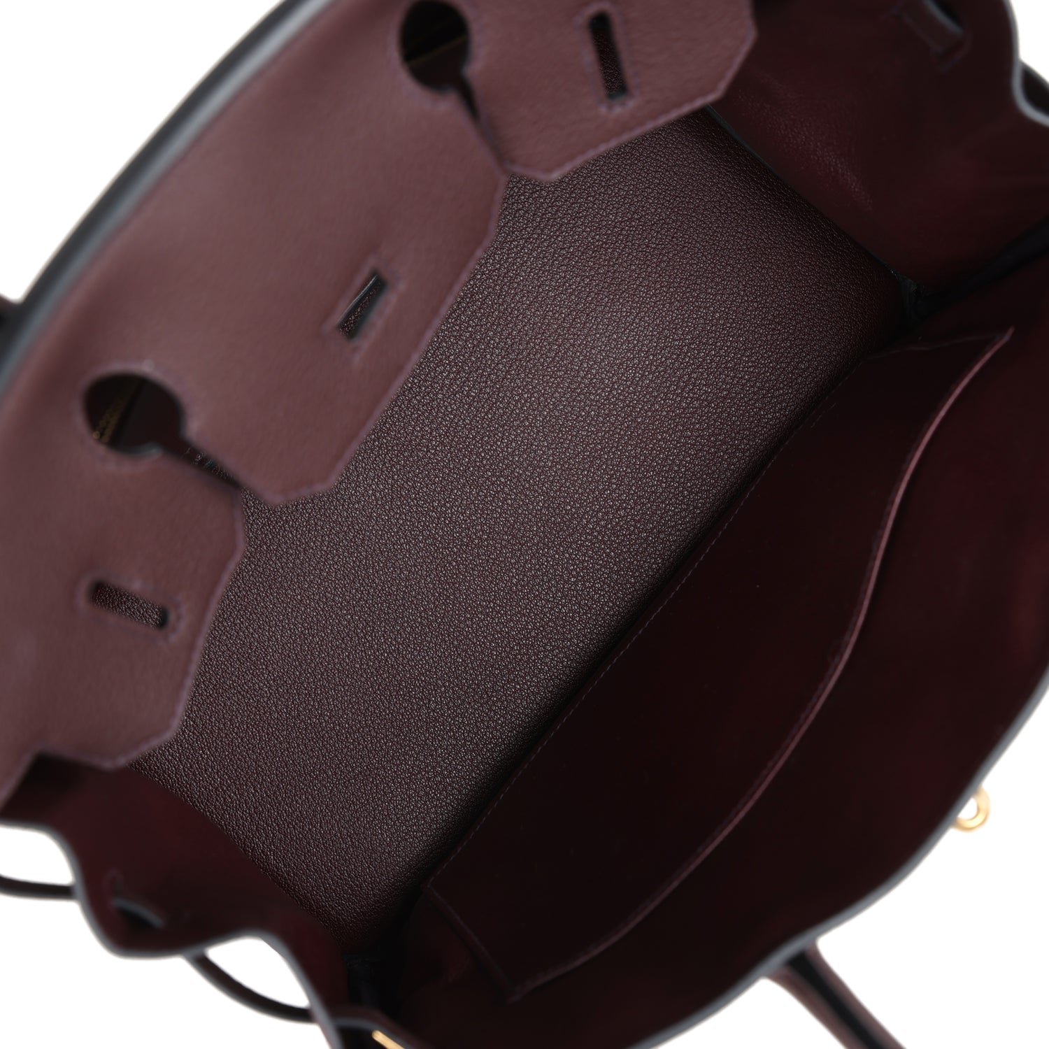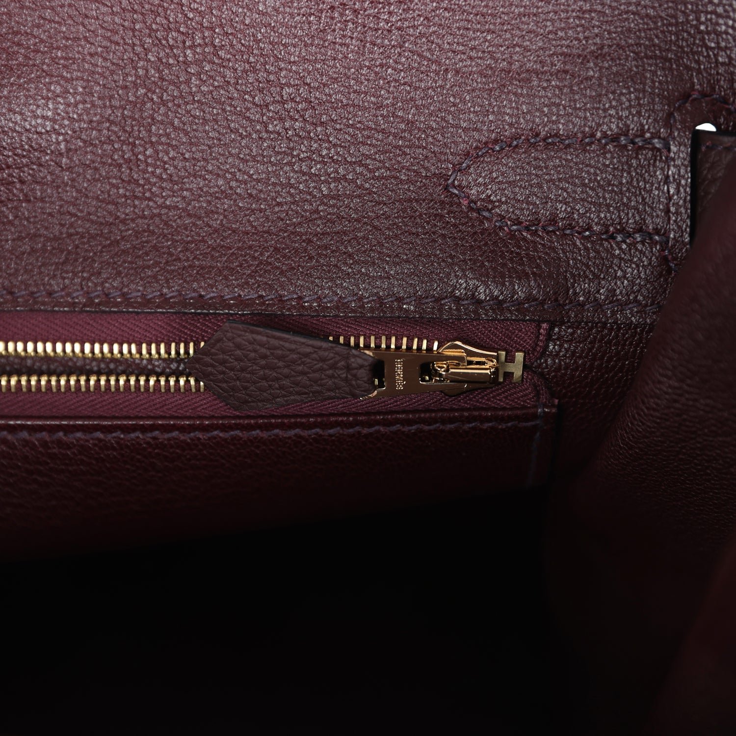 This Birkin is in Rouge Sellier togo leather with gold hardware and has tonal stitching, front flap, two straps with center toggle closure, clochette with lock and two keys, and double rolled handles.