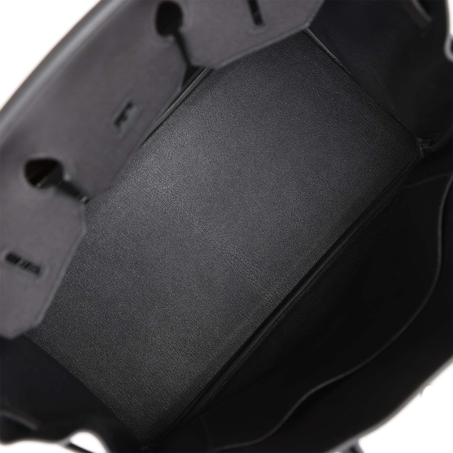 The interior is lined with black chevre and has one zip pocket with an Hermès engraved zipper pull and an open pocket on the opposite side.