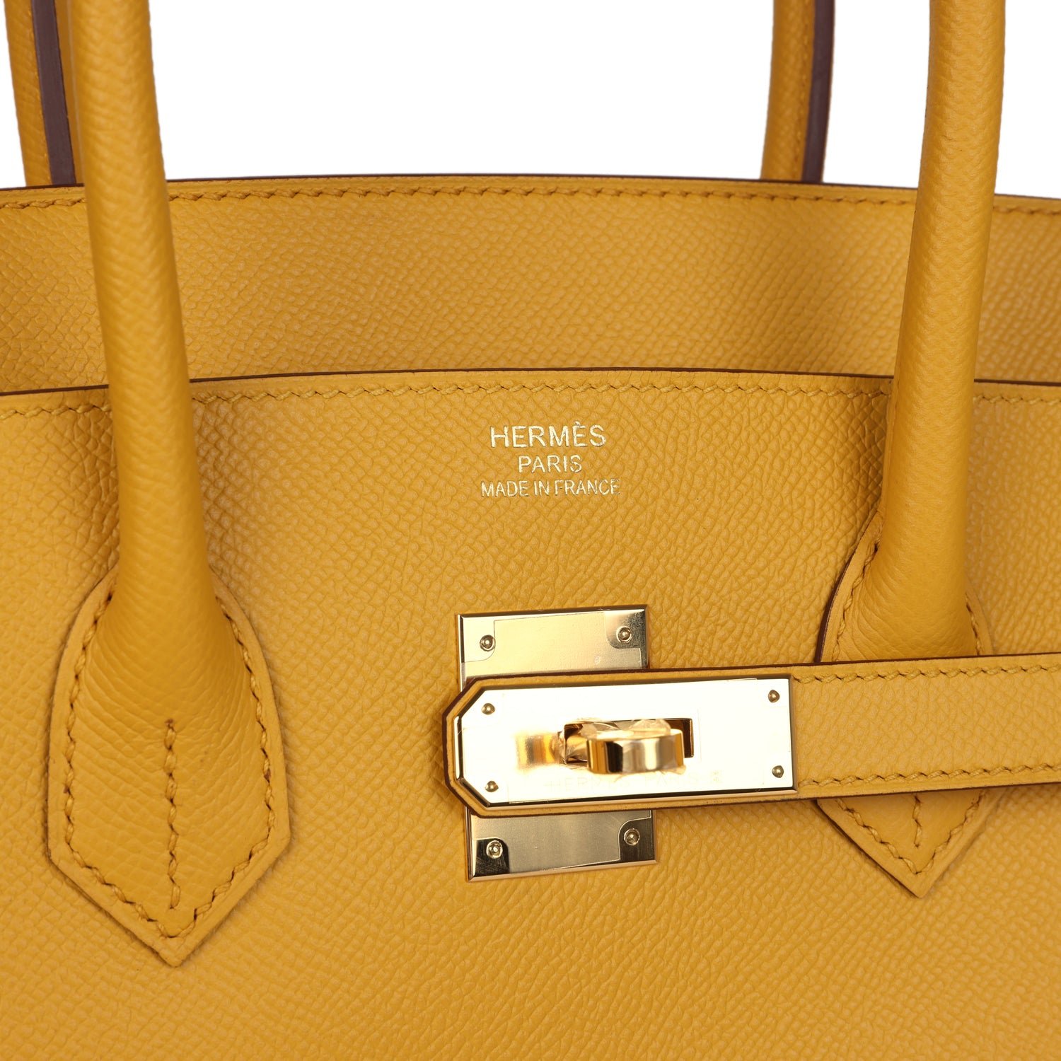ThisBirkin is in Jaune Ambre epsom leather with gold hardware and has tonal stitching, front flap, two straps with center toggle closure, clochette with lock and two keys, and double rolled handles.