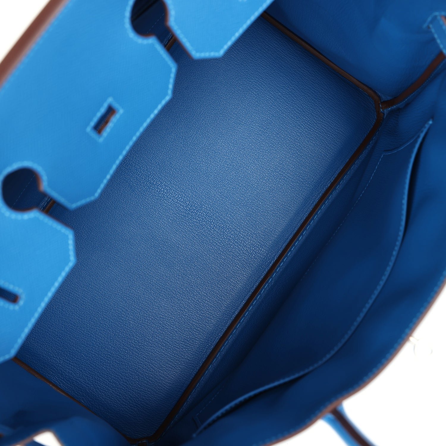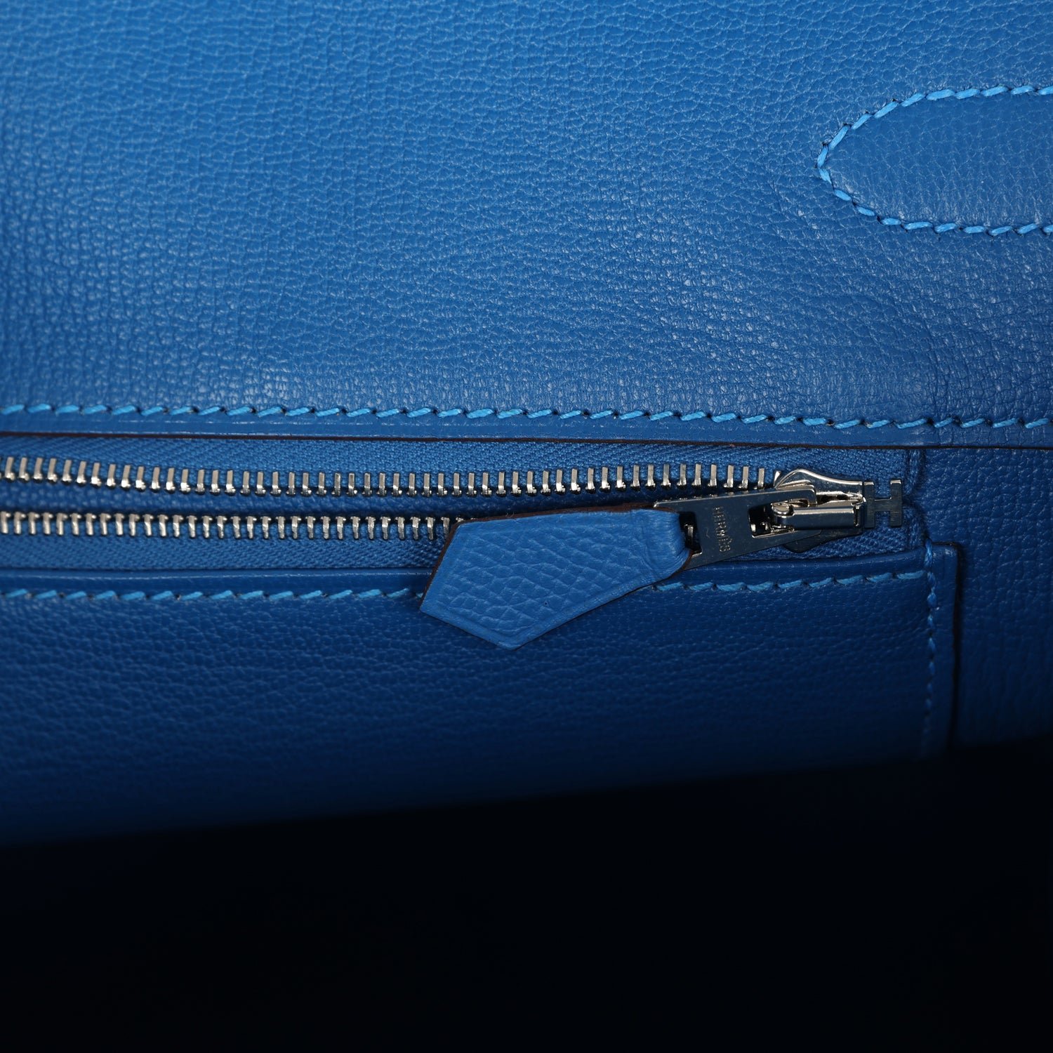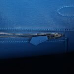 The interior is lined with Bleu Mykonos chevre and has one zip pocket with an Hermès engraved zipper pull and an open pocket on the opposite side.