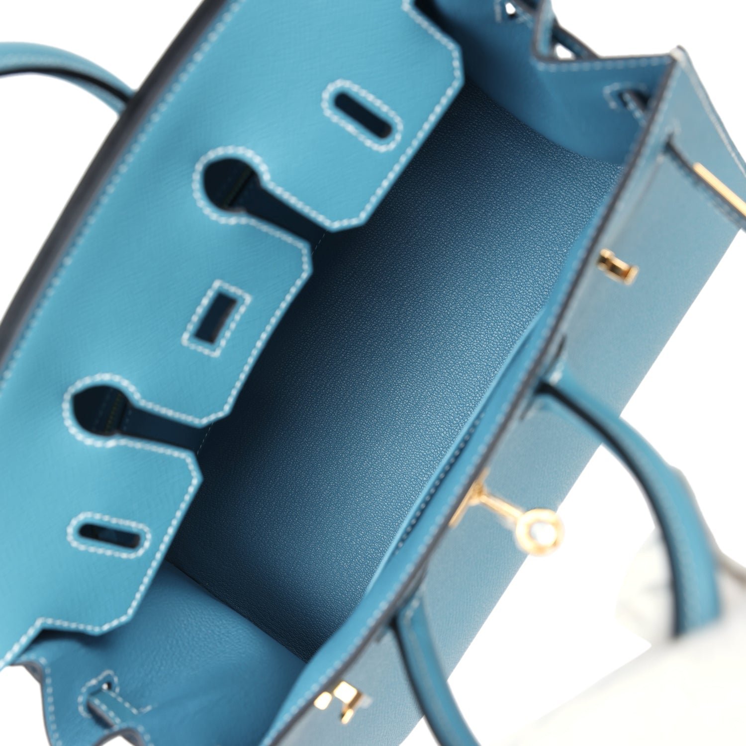 The interior is lined with Blue Jean chevre, has one zip pocket with an Hermès engraved zipper pull and an open pocket on the opposite side.