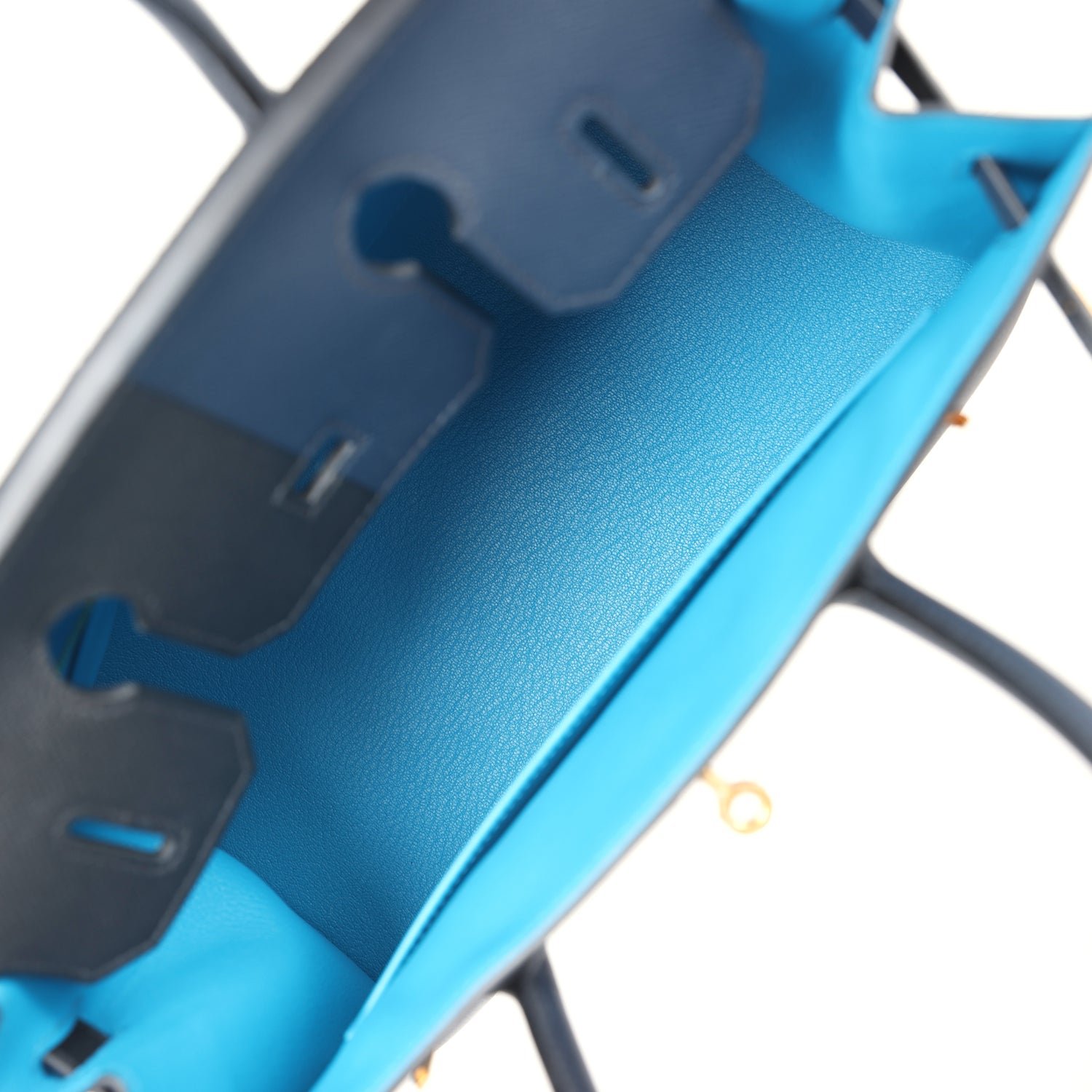 The interior is lined with Bleu Frida chevre and has one zip pocket with an Hermès engraved zipper pull and an open pocket on the opposite side.