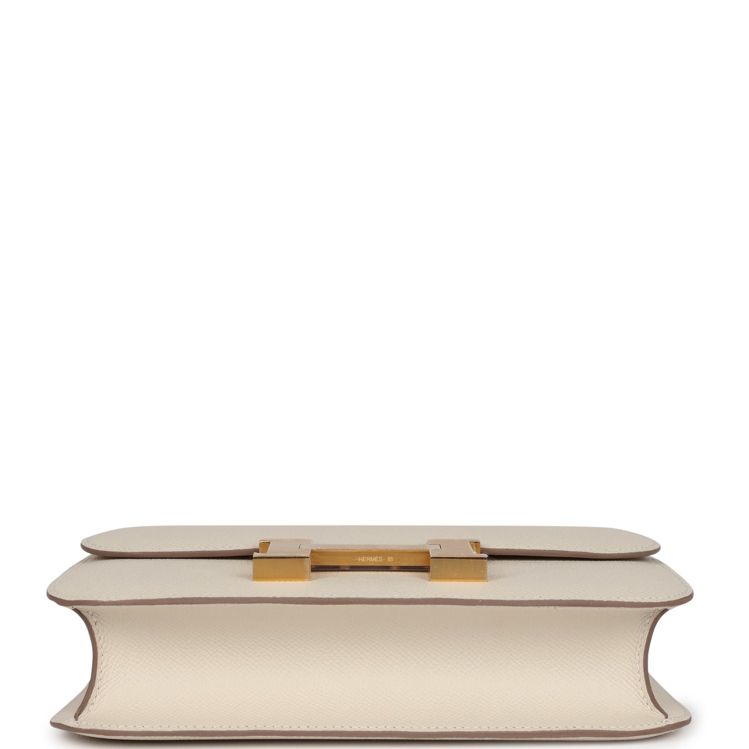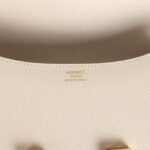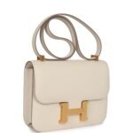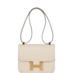 This Constance is in Craie epsom leather with brushed gold hardware and has tonal stitching, a metal “H” snap lock closure and adjustable shoulder strap.