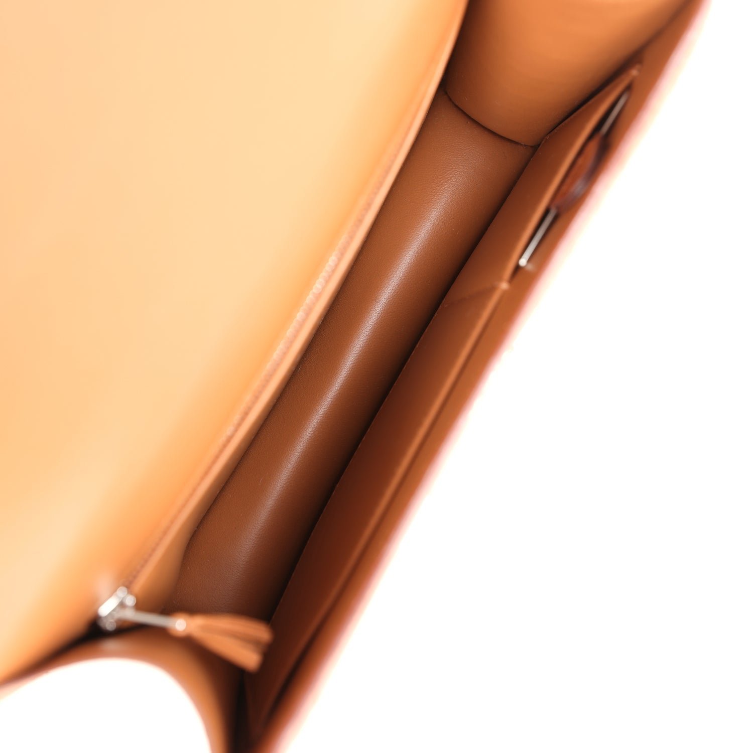 The interior is lined with Gold lambskin and has two open pockets on the front wall, one with a removable mirror, and a back zip pocket.