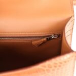 This Constance 1-24 is in Gold Matte Alligator Mississippiensis leather with Marquette and palladium hardware and has tonal stitching, a metal “H” snap lock closure and adjustable shoulder strap.