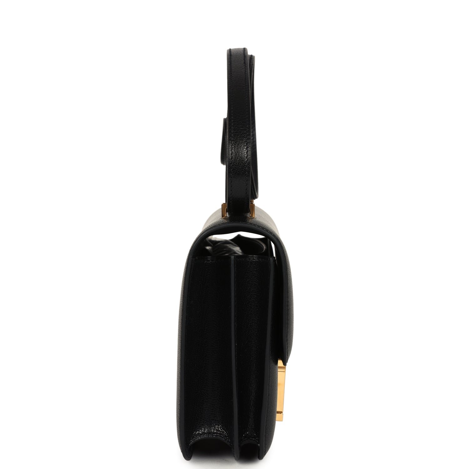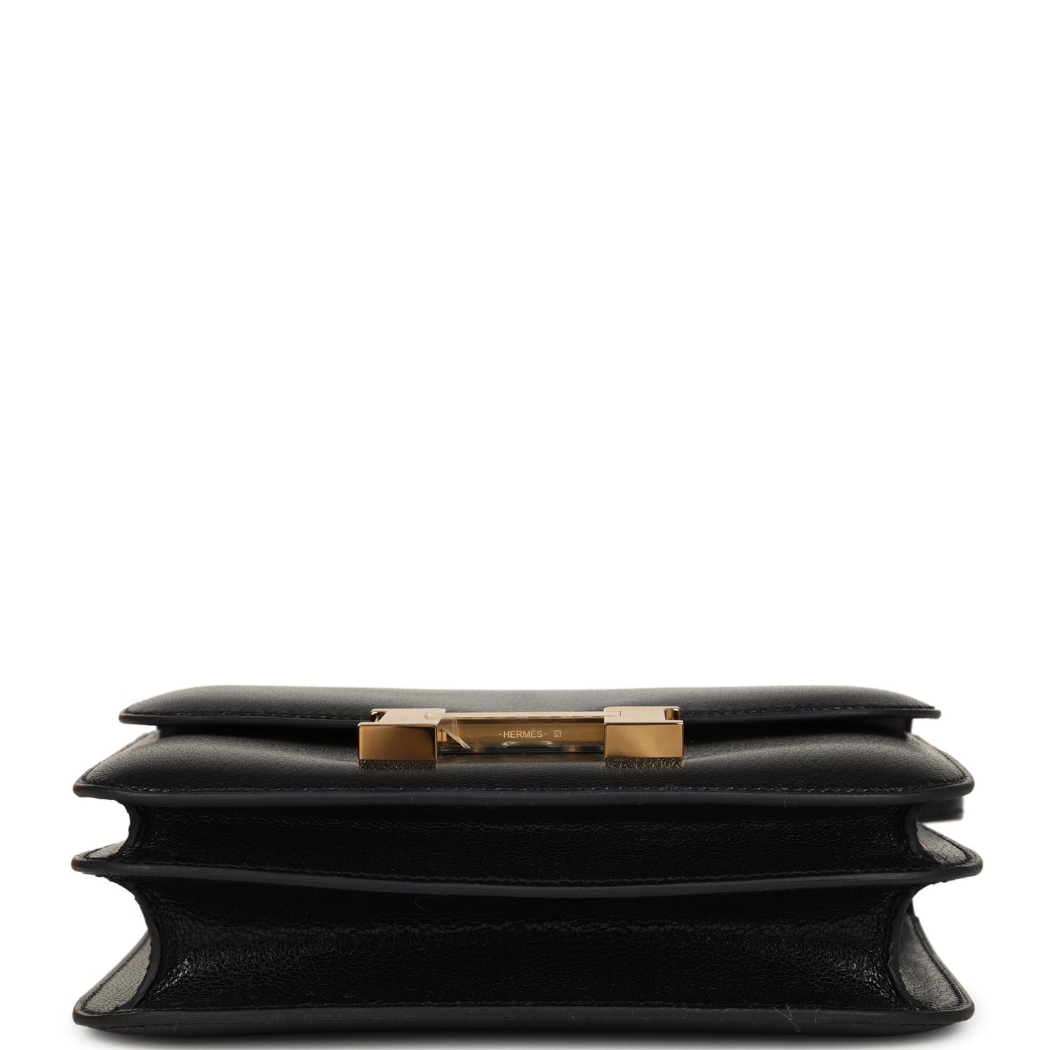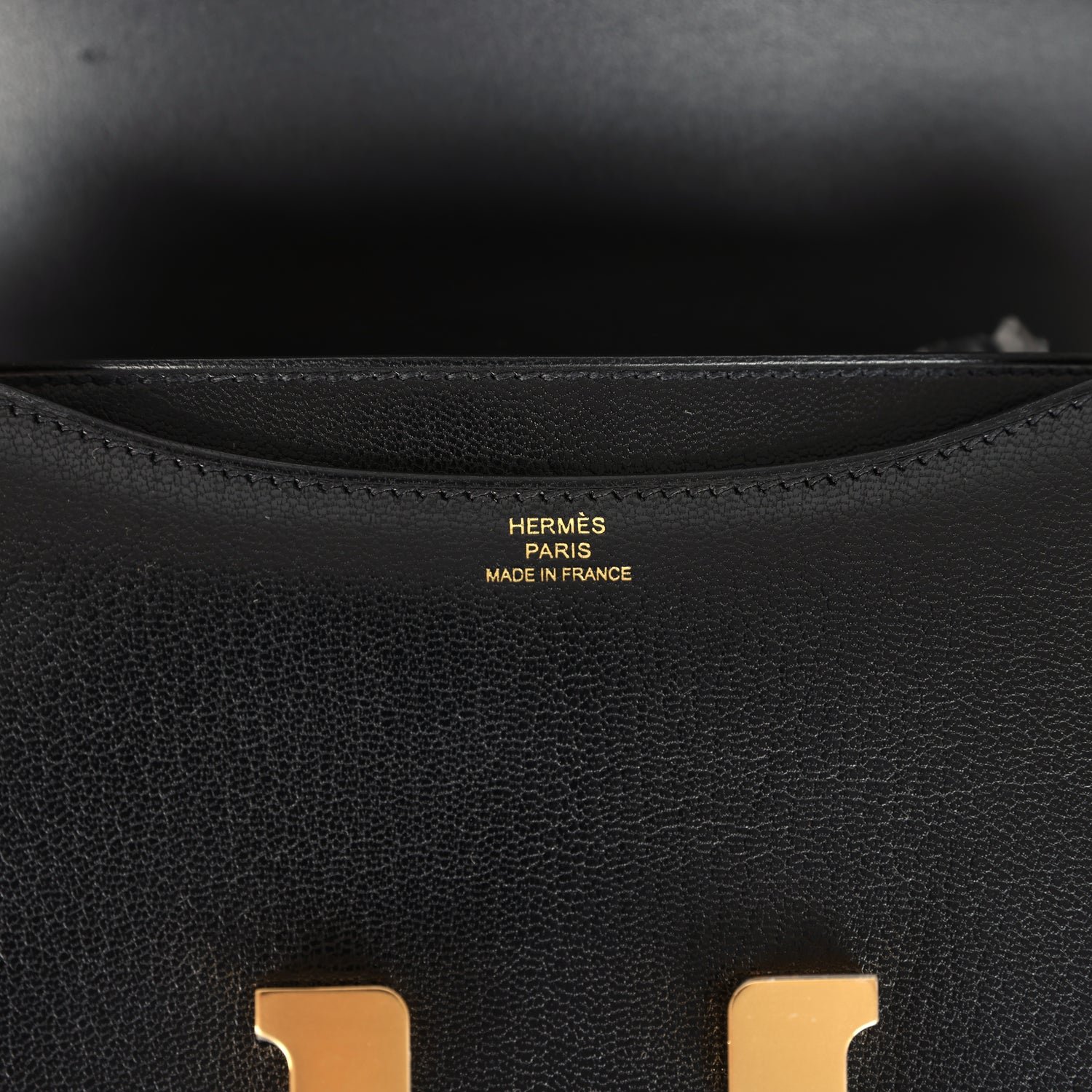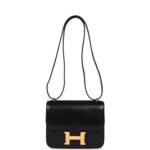 This Constance is inBlackchevre chamkila leatherwith gold hardware and hastonal stitching, ametal “H” snap lock closure and adjustable shoulder strap.