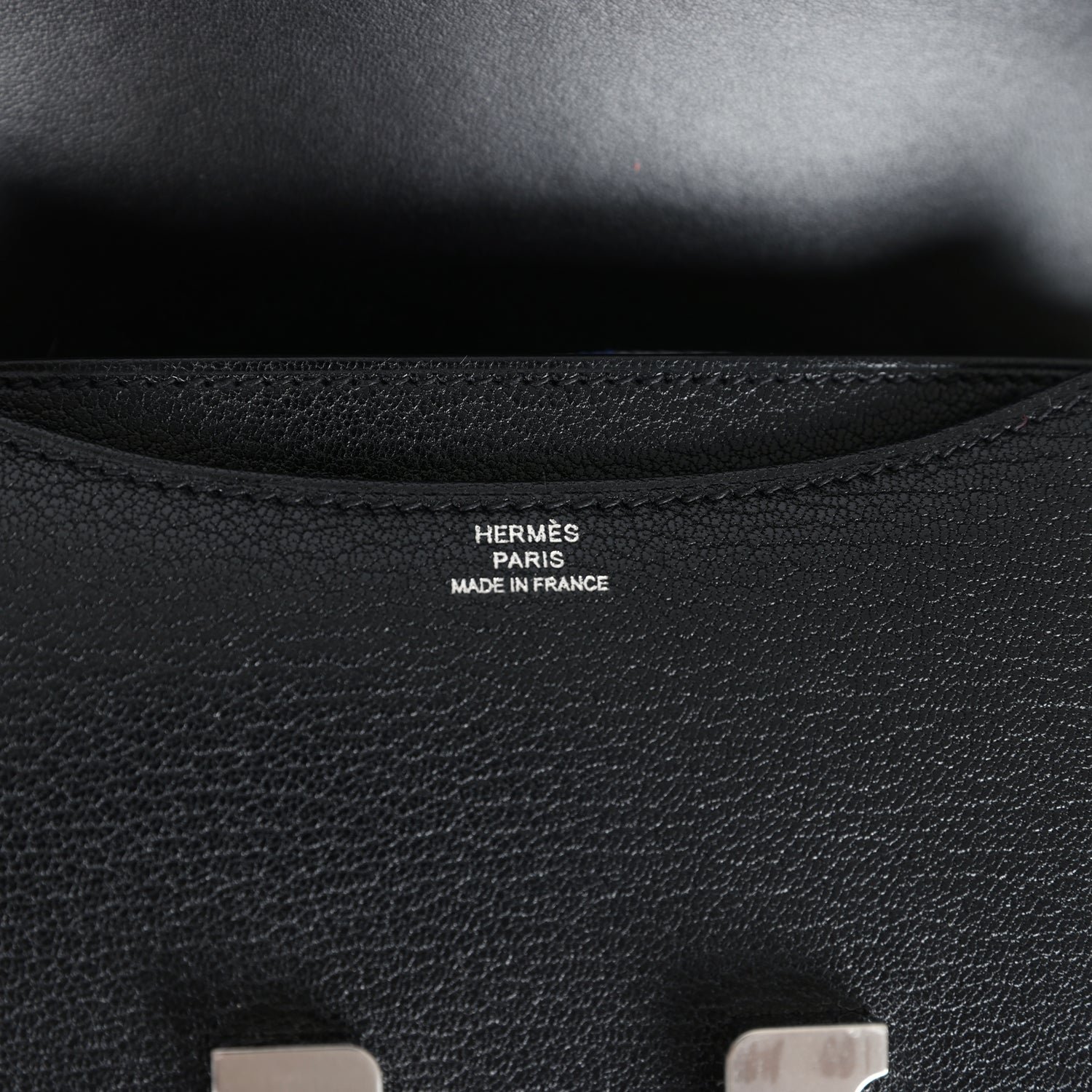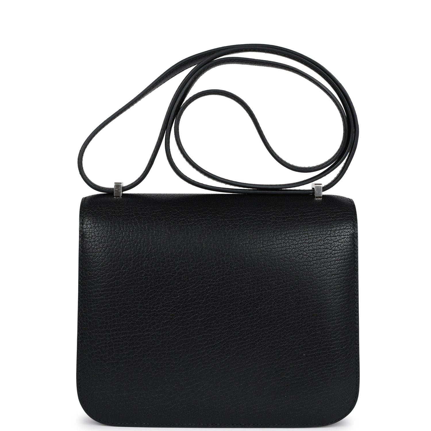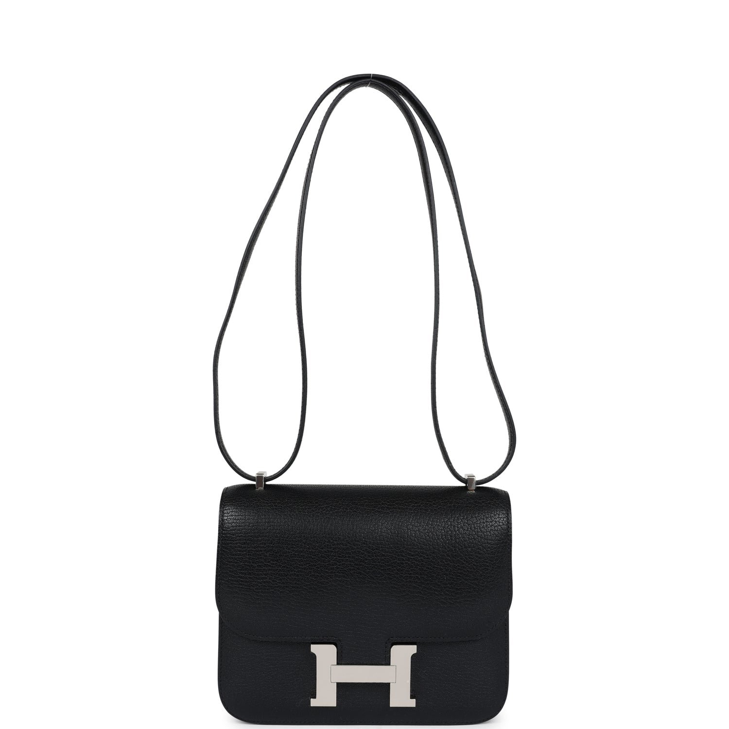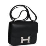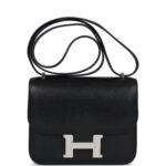 This Constance is in Black chevre chamkila leather with palladium hardware and has tonal stitching, a metal “H” snap lock closure and adjustable shoulder strap.