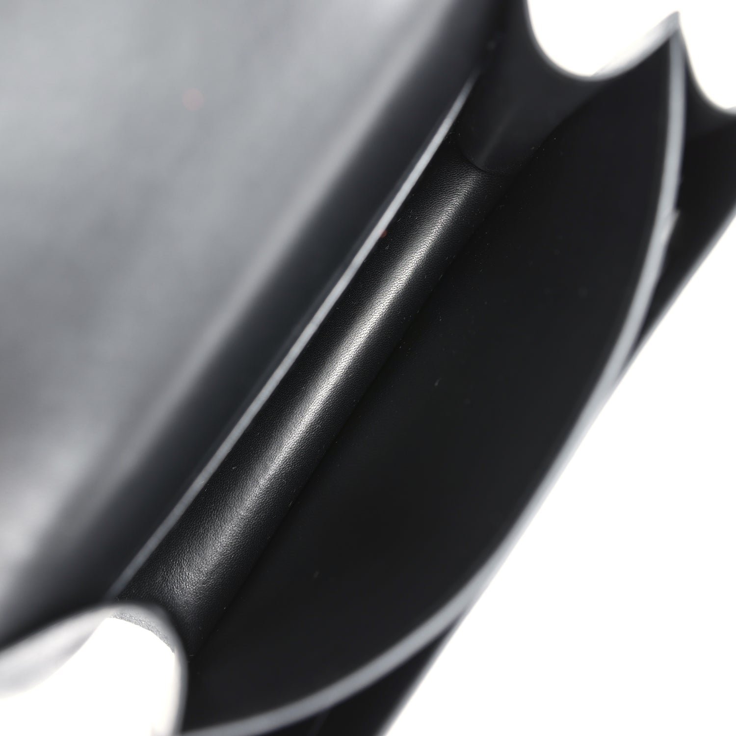 The interior is lined with Black lambskin and has an open pocket on the front wall, a center divide, removable mirror and a slit pocket on the back wall.