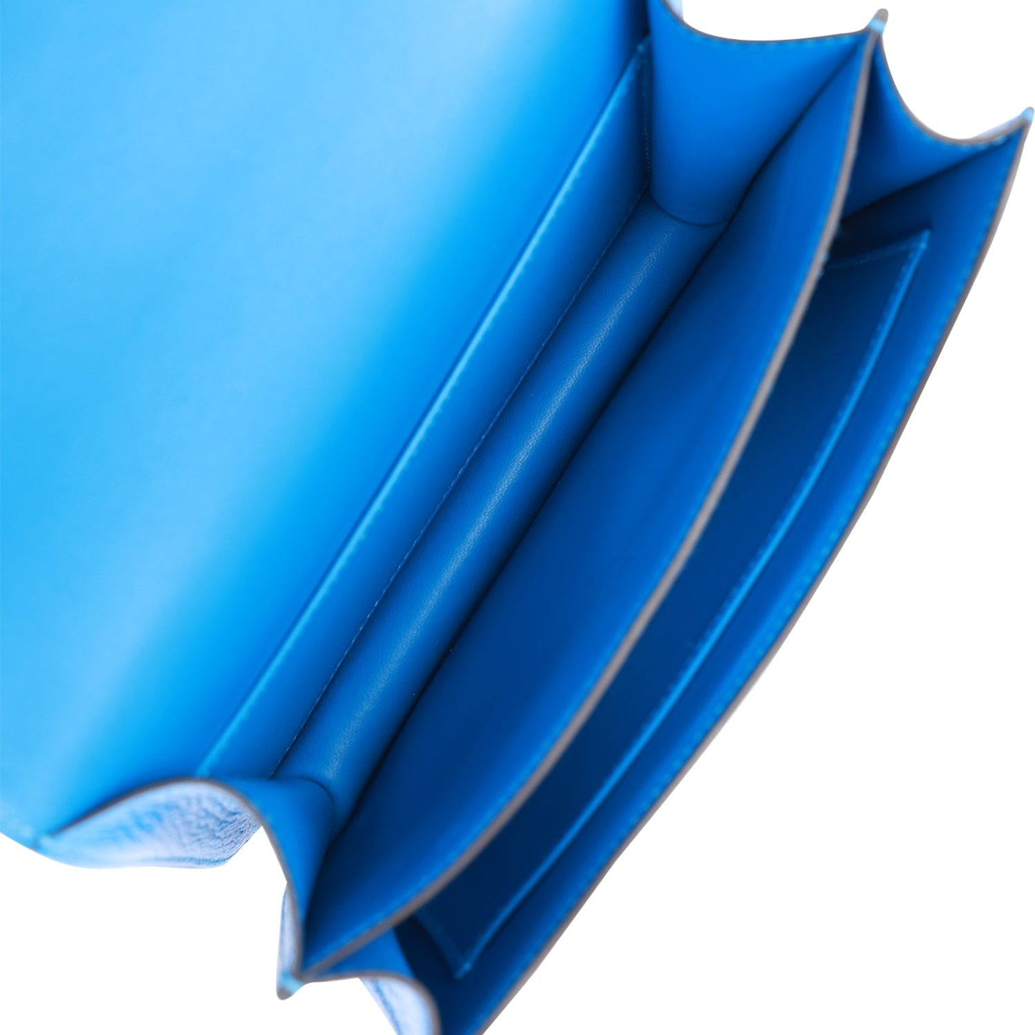 The interior is lined with Bleu Hydra lambskin with an open pocket on the front wall, a compartment in the middle and an open pocket on the back wall.