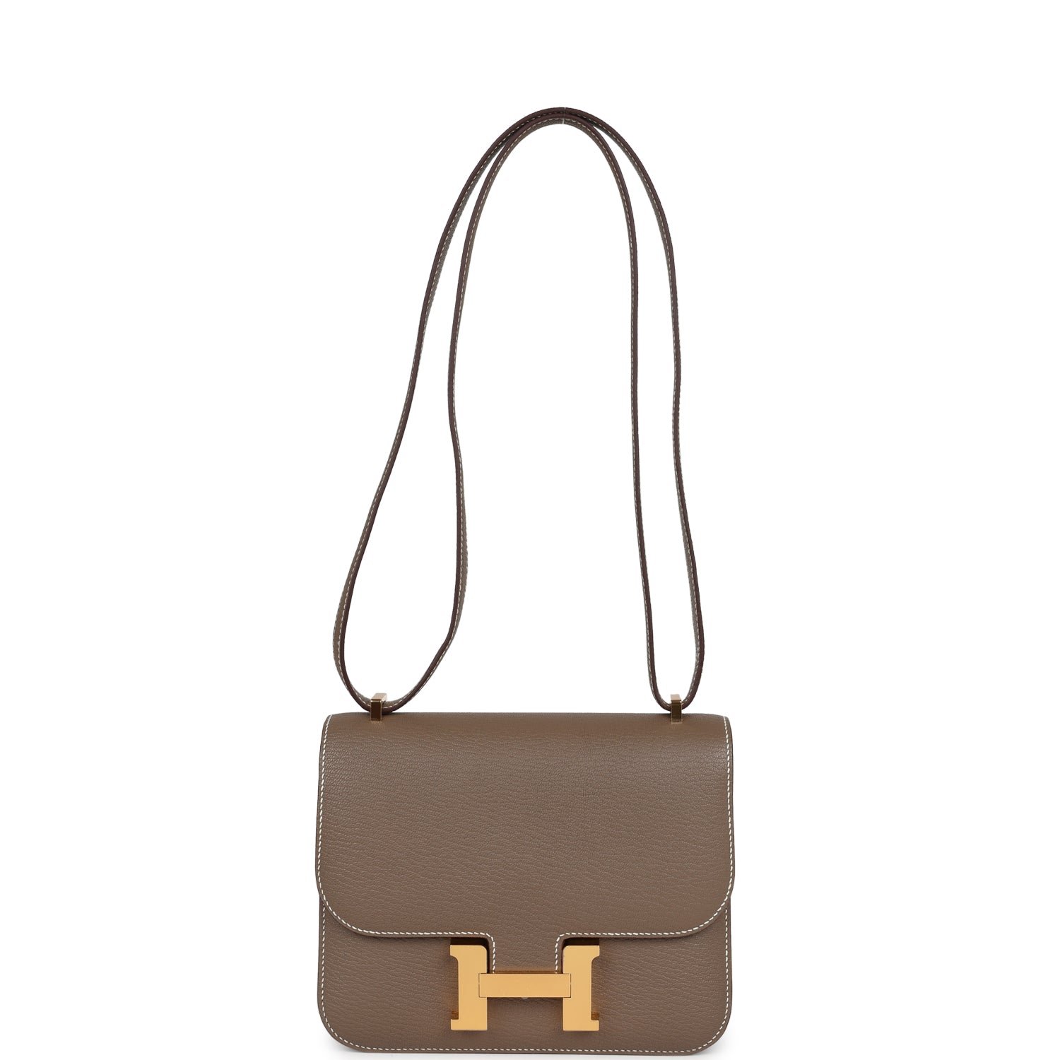This Constance 1-18 is in Etoupe Chevre Mysore leather with gold hardware, contrast stitching, a metal “H” snap lock closure and adjustable shoulder strap.