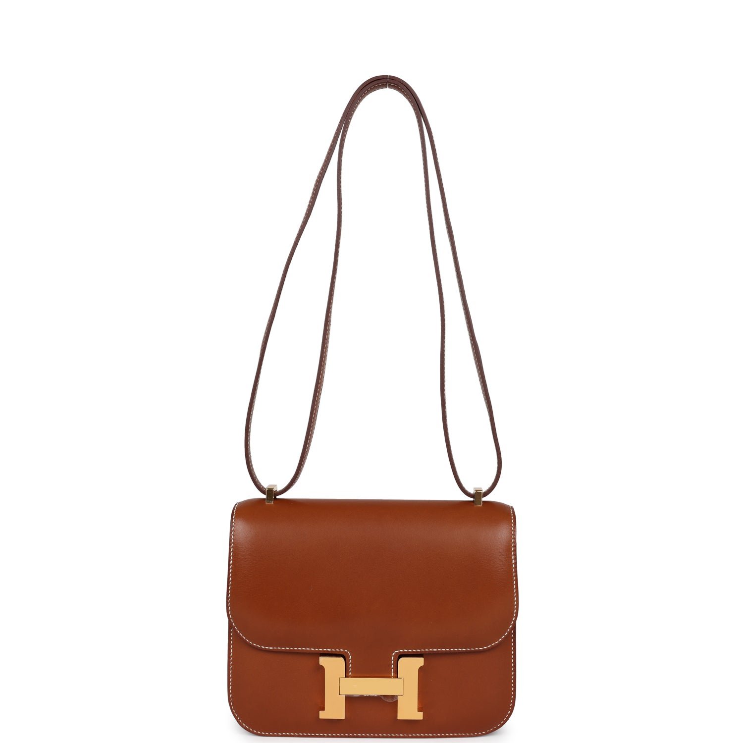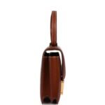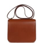 This Constance 1-18 is in Fauve Barenia leather with gold hardware and has contrast stitching, a metal “H” snap lock closure and adjustable shoulder strap.