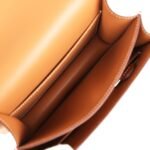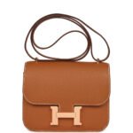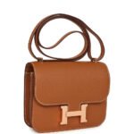 This Constance is in Gold epsom leather with rose gold hardware and has contrast stitching, a metal “H” snap lock closure and adjustable shoulder strap.
