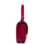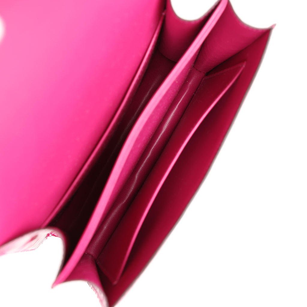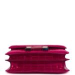 This Constance is in Rose Pourpre Shiny Alligator with palladium hardware and has tonal stitching, metal “H” snap closure, and an adjustable strap, has two open pocket on the front wall, a center divide, and a slit pocket on the back wall.