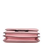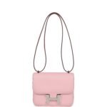 This Constance 18 is in Rose Sakura swift leather with palladium hardware, tonal stitching, a metal “H” snap lock closure and adjustable shoulder strap.