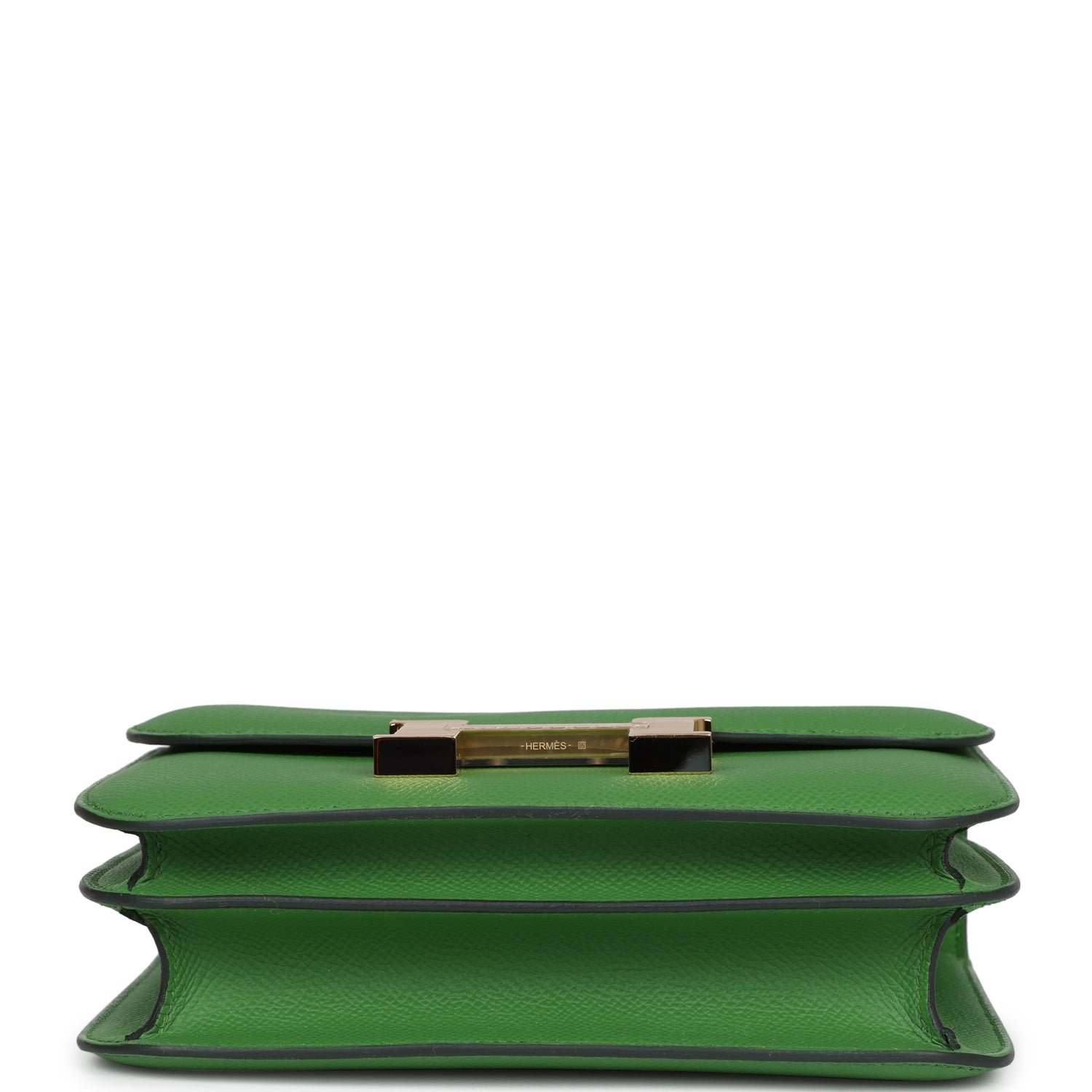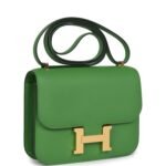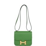 This Constance 1-18 is in Vert Yucca epsom leather with gold hardware and has tonal stitching, a gold “H” snap lock closure and adjustable shoulder strap.