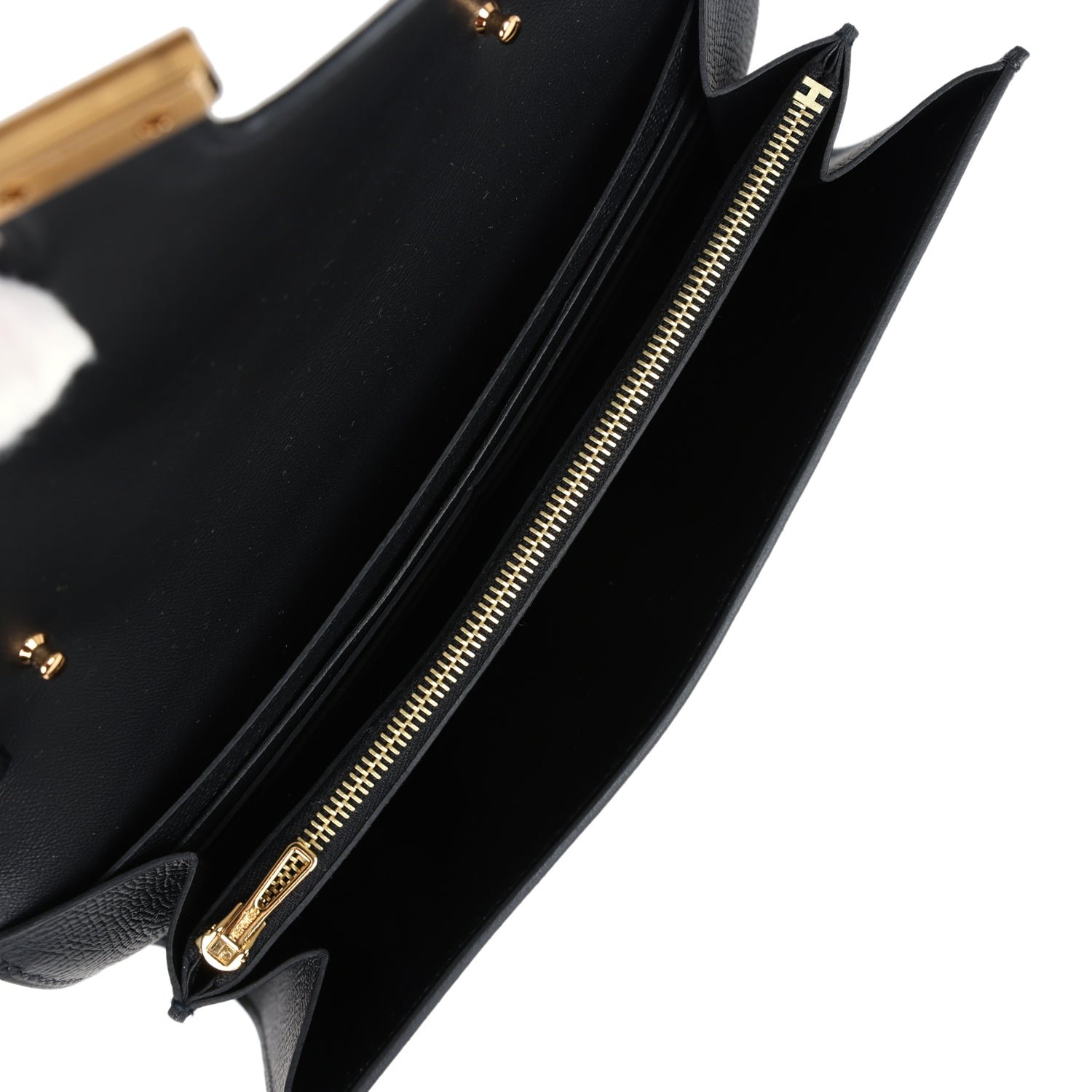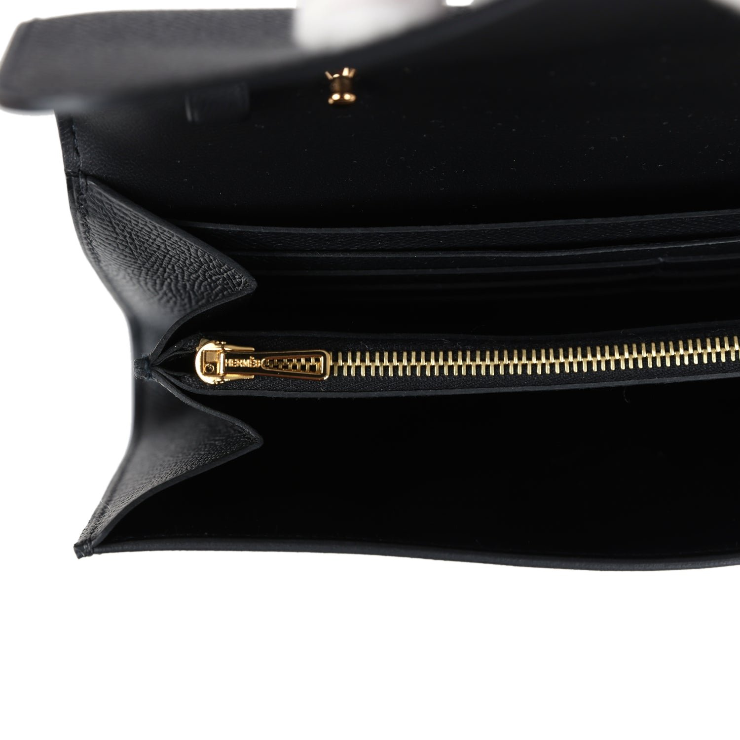 The interior is lined with Black epsom leather and two main compartments with six credit card slots and a zippered center compartment with Hermès H lock pull.