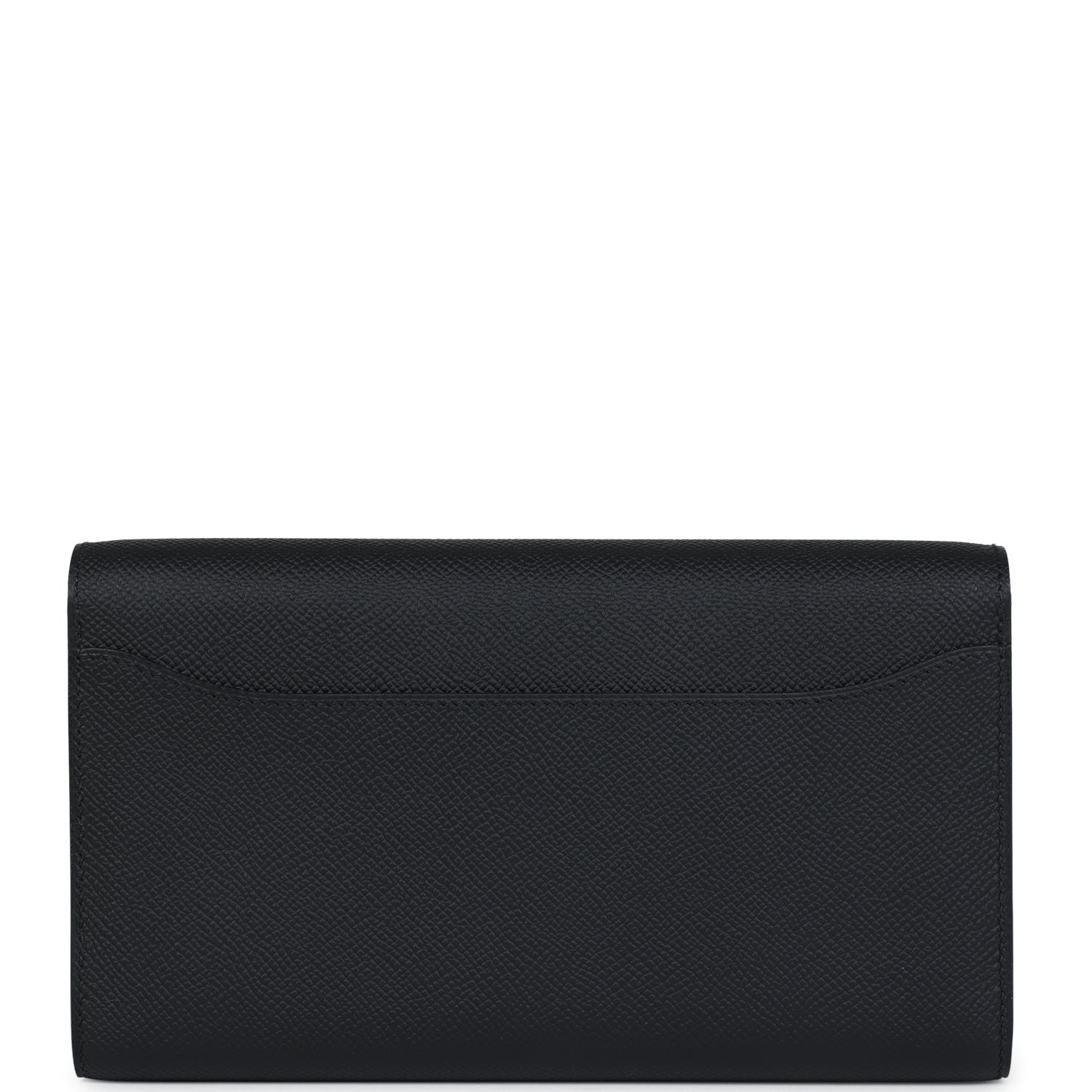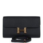 This Constance Wallet To Go is in Black epsom leather withgold hardware and has tonal stitching, metal “H” snap lock closure, open front compartment and removable crossbody strap.