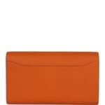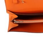 The interior is lined with Orange lambskin and two main compartments with six credit card slots and a zippered center compartment with Hermès H lock pull.