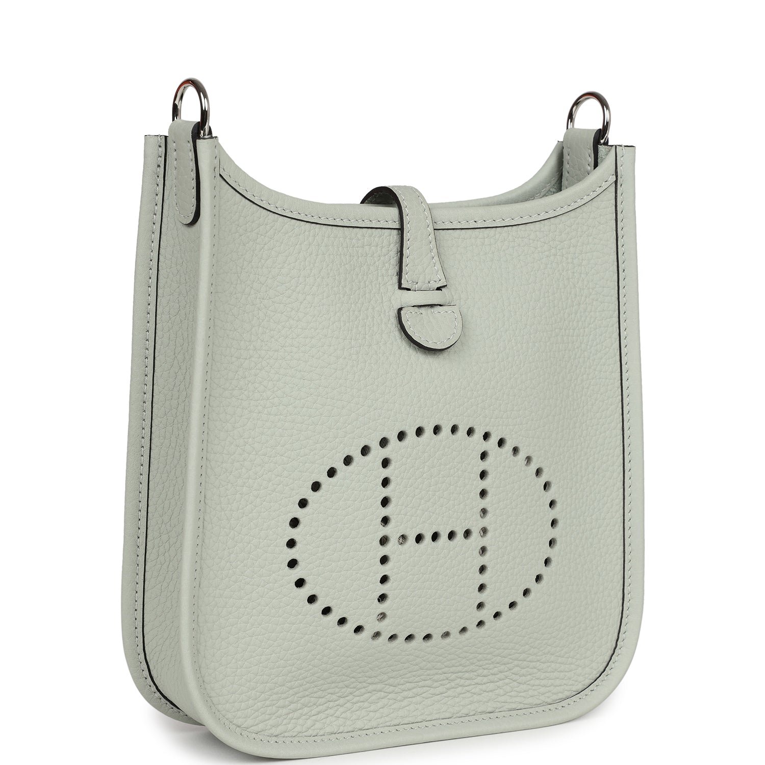 This Evelyne TPM is in Gris Neve clemence leather with Palladium hardware and features tonal stitching, large perforated H in circle (front), pull tab top closure and a matching removable canvas and leather shoulder/crossbody strap.