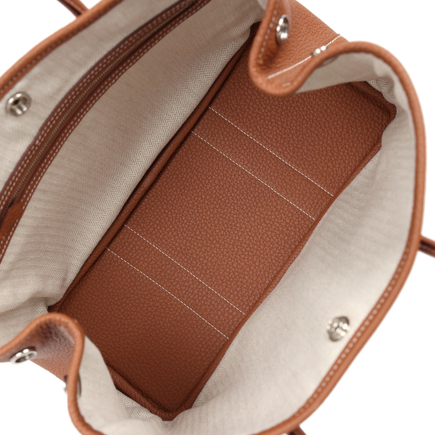 ThisGarden Party 30 is in Gold negonda with palladium hardware and has contrast stitching, one engraved palladium front snap closure with two snap closures on the side to adjust bag width and two top handles.
