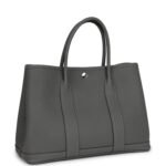 This Garden Party is in Gris Meyer Negonda with palladium plated hardware, features tonal stitching, Clou de Selle snap closure, and double rolled handles.