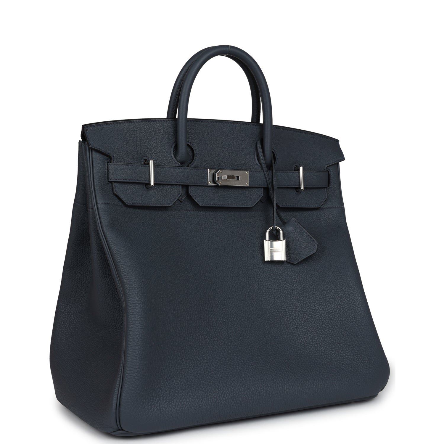 This HAC Birkin 40 is in Gris Misty togo leather with palladium hardware, tonal stitching, front flap with two straps, front toggle closure and clochette, lock and two keys, and double rolled handles.