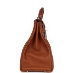 This Hermès Kelly 42 Maxi, in the Retourne style, is of Fauve Barenia Faubourg leather with palladium hardware and features contrast stitching, front flap with two straps, front toggle closure, clochette with lock and two keys, a single rolled handle and a detachable canvas Fauve shoulder strap.
