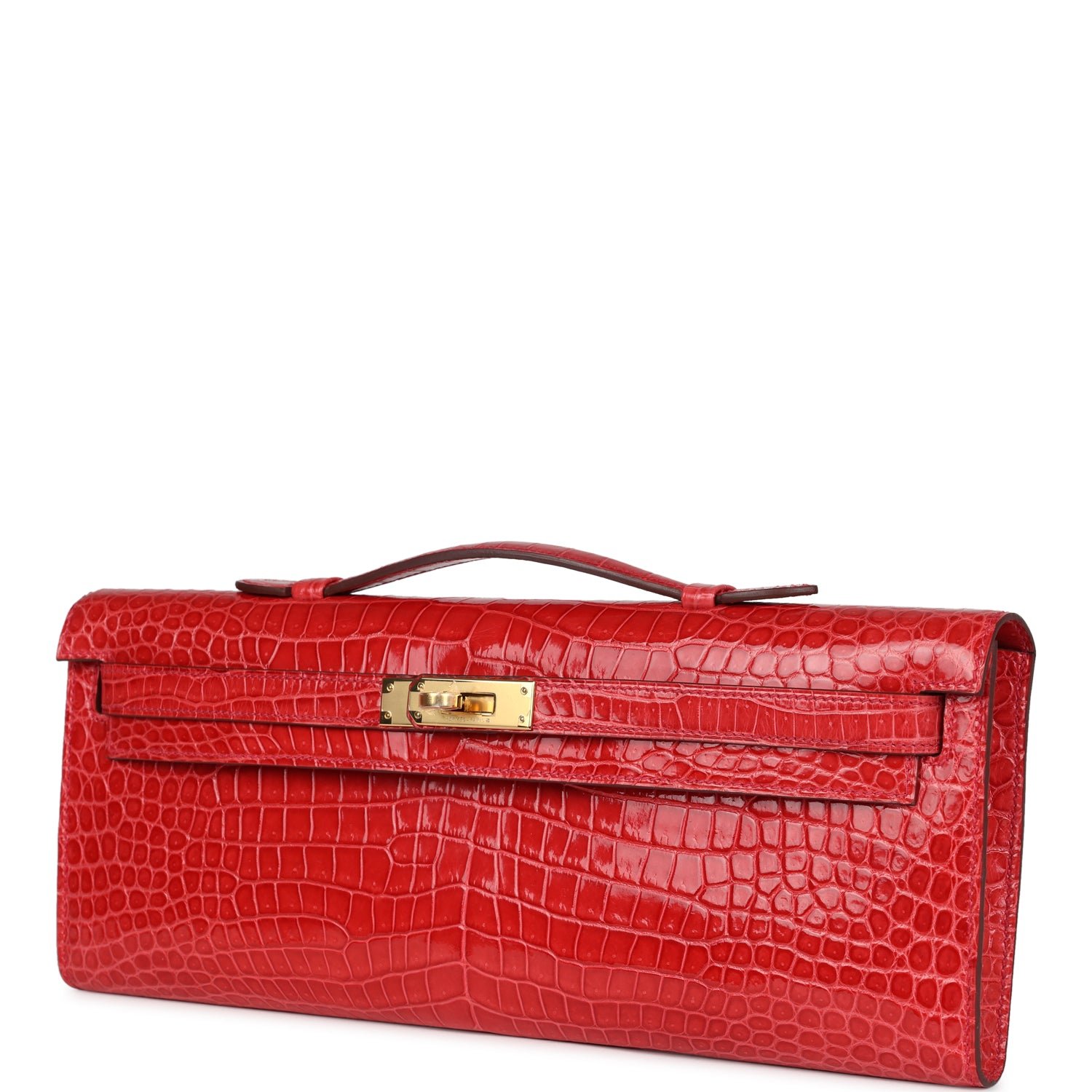 This Kelly Cut is in Bougainvillea shiny porosus crocodile with gold hardware and has tonal stitching, two straps with front toggle closure and a top flat handle.