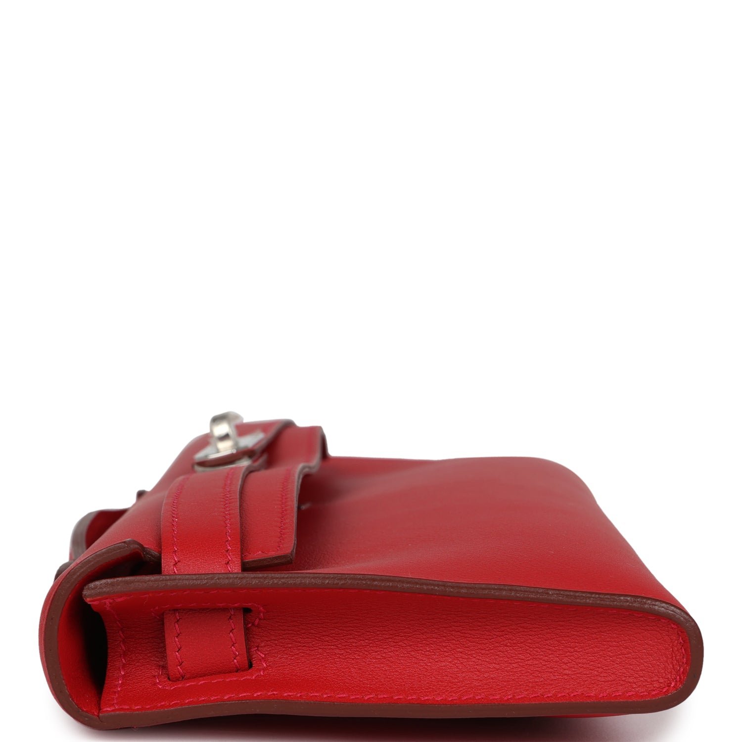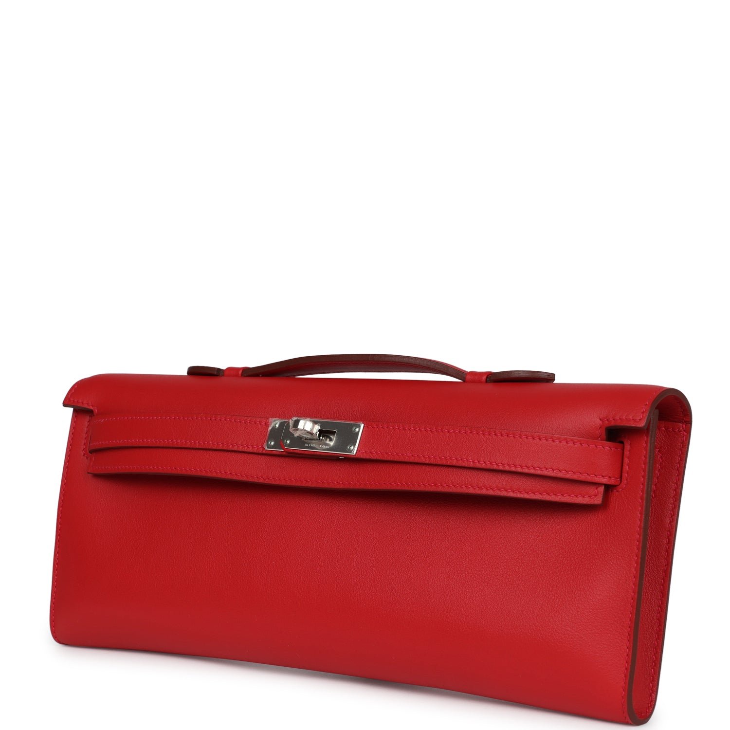 This Kelly Cut is in Rouge Casaque swift leather with palladium hardware and has tonal stitching, two straps with front toggle closure and a top flat handle.