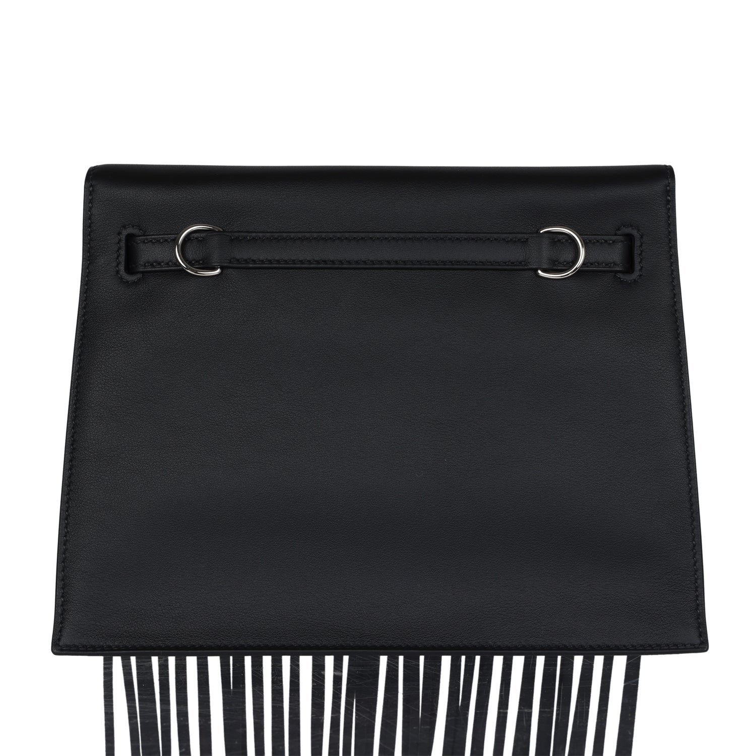 This limited edition Kelly Danse Anate is in Black swift leather with palladium hardware and has tonal stitching, long fringe detailing, two straps with front flap closure and an adjustable flat crossbody/backpack/belt strap.