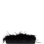 This Kelly Elan Foile Black chevre chamkila leather and ostrich feathers with palladium hardware, two pull straps that attach to a toggle, ostrich feathers on front of bag, and an interior that has snaps for detachable shoulder strap.