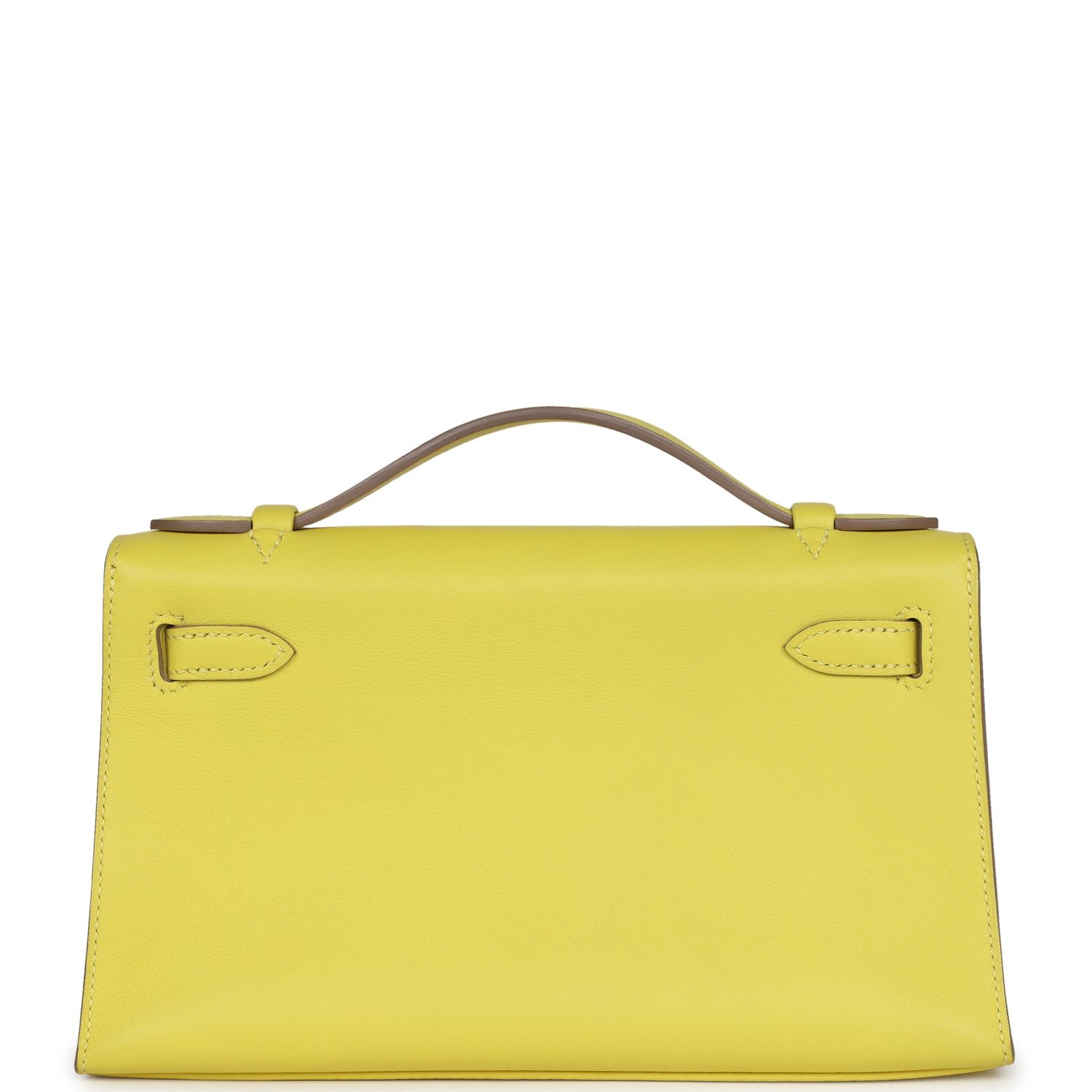 This Kelly Pochette is in Lime swift leather with gold hardware and has tonal stitching, front flap, two straps with center toggle closure and a top flat handle.