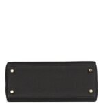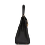 This Retourne Kelly is ofblack togo leather with gold hardware and hastonal stitching, front flap, two straps with center toggle closure, clochette with lock and two keys, single rolled handle and an optional shoulder strap.