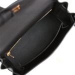 The interior is lined withblack chevre leather and has one zip pocket with an Hermès engraved pull and one open pocket on the opposite side.